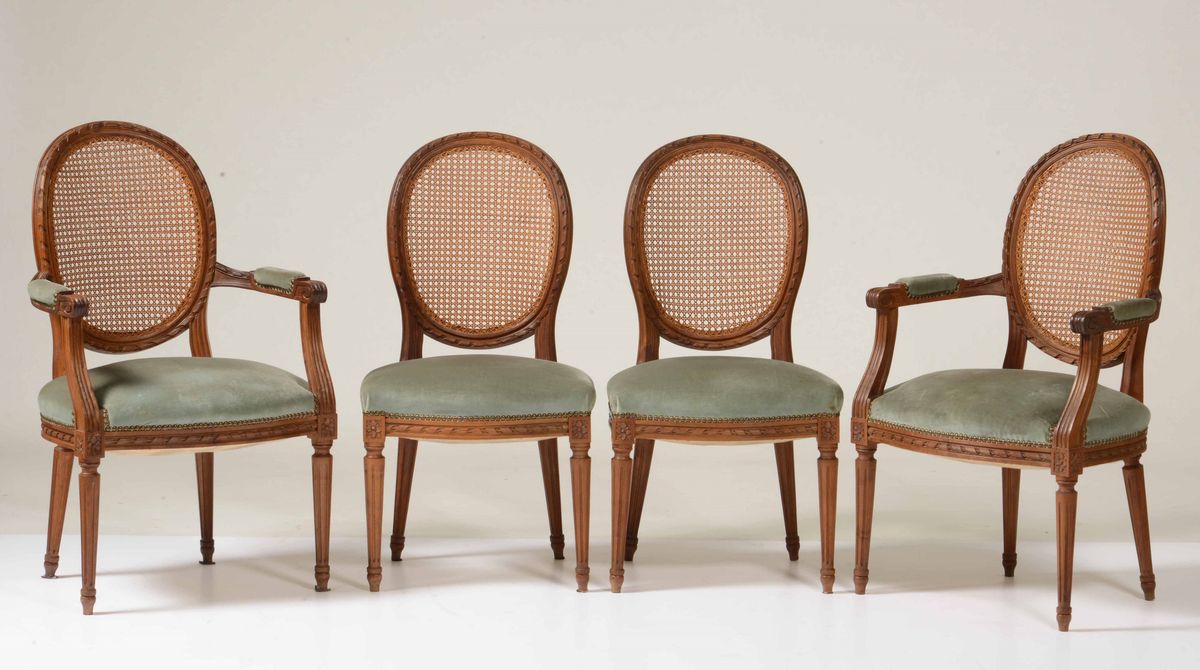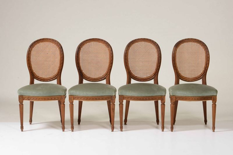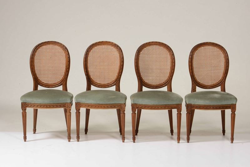 Gruppo di dieci sedie e due poltrone in stile Luigi XVI