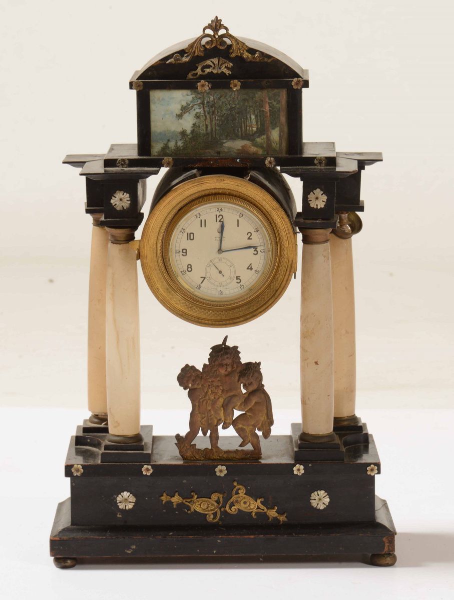 Cassa in legno con colonne in alabastro, fregi in metallo dorato raffiguranti gioco di putti