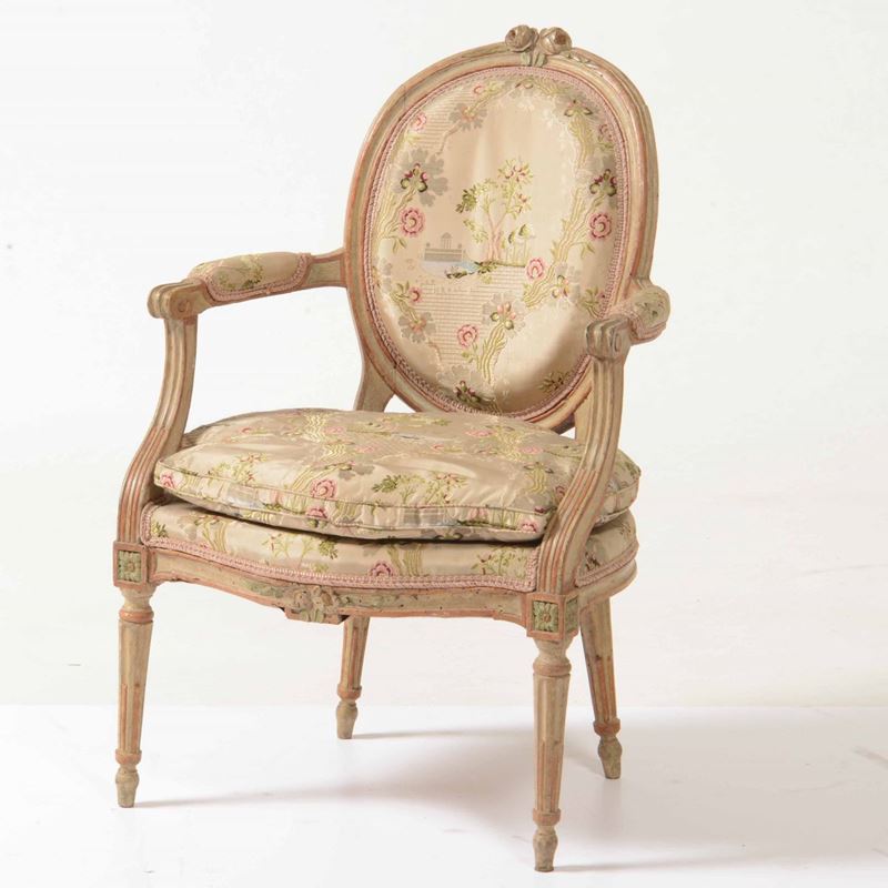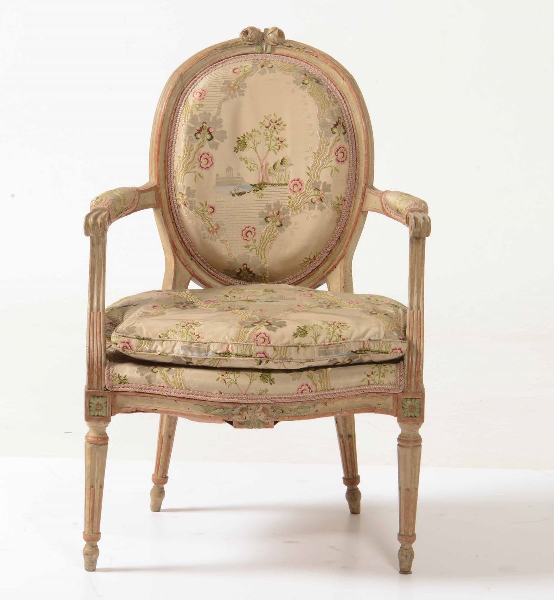Poltrona in legno intagliato e laccato avorio. Fine XVIII secolo