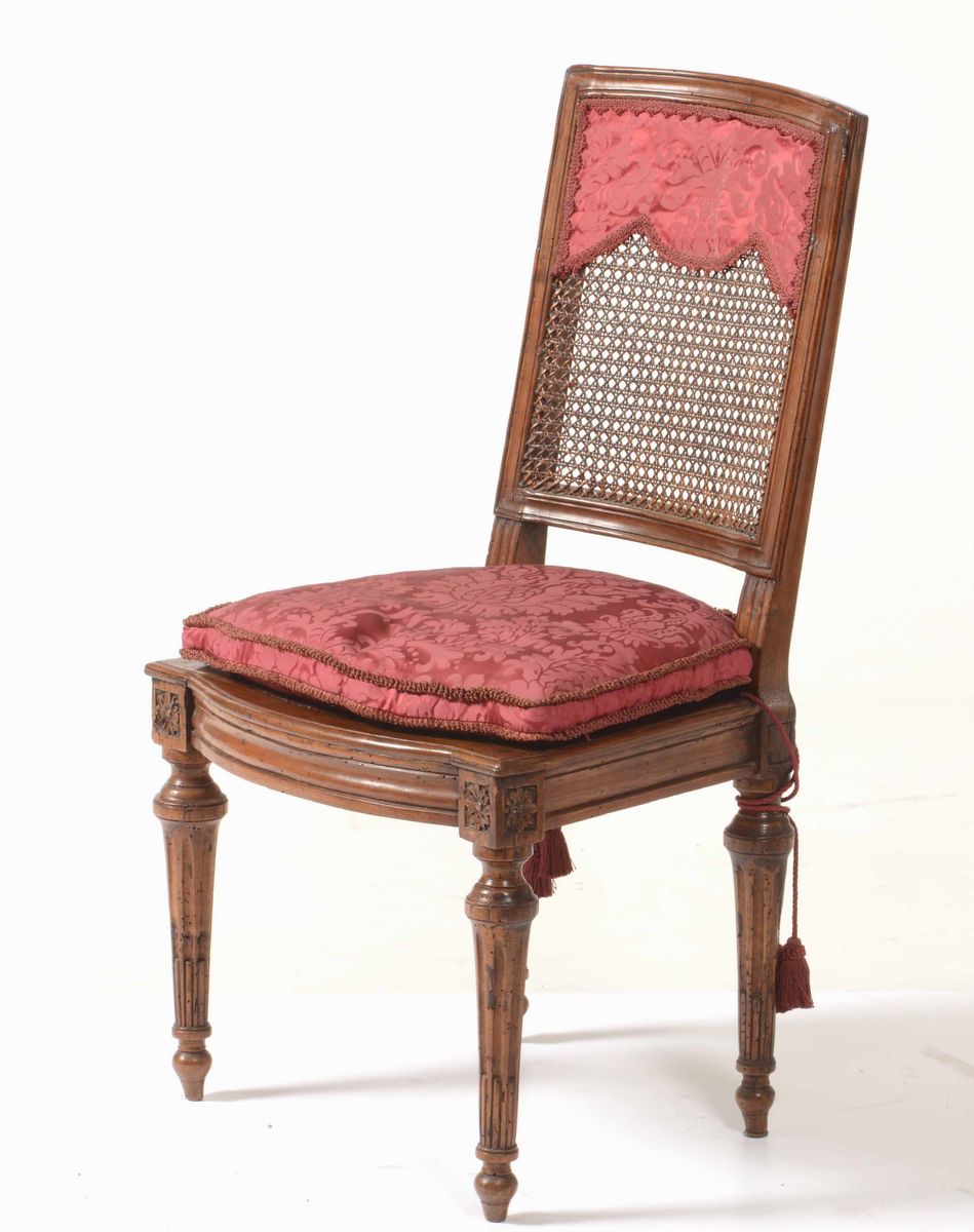 Sedia Luigi XVI in noce intagliato e cannetè. Fine XVIII secolo