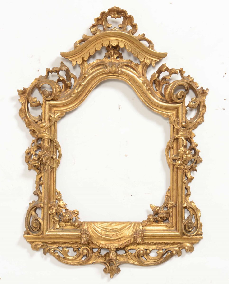 decori traforati a motivo di volute e fogliacei, cimasa centrata da corona
