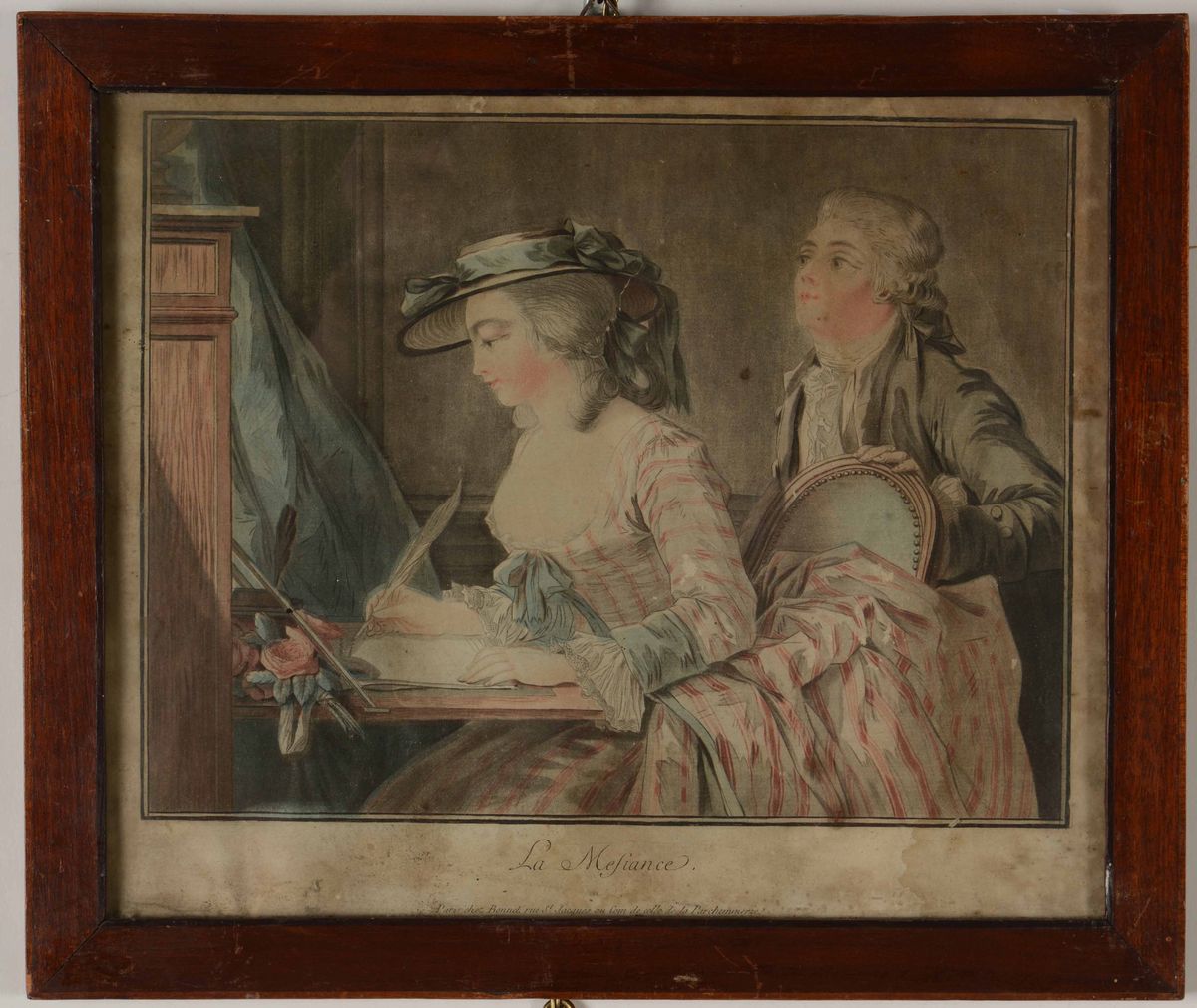 Stampa colorata raffigurante "La Mesiance". Francia XIX secolo
