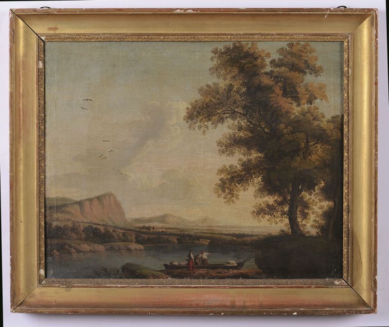 Scuola romana del XVIII secolo Paesaggio con pescatore
