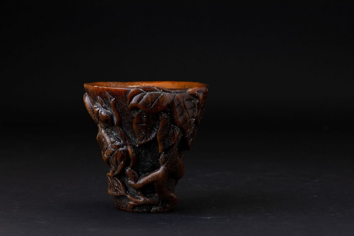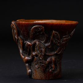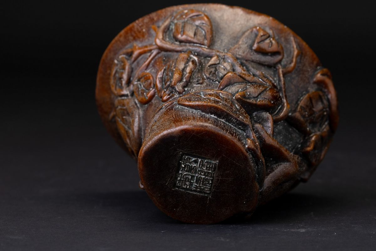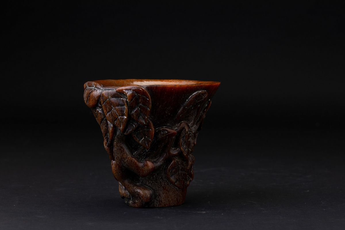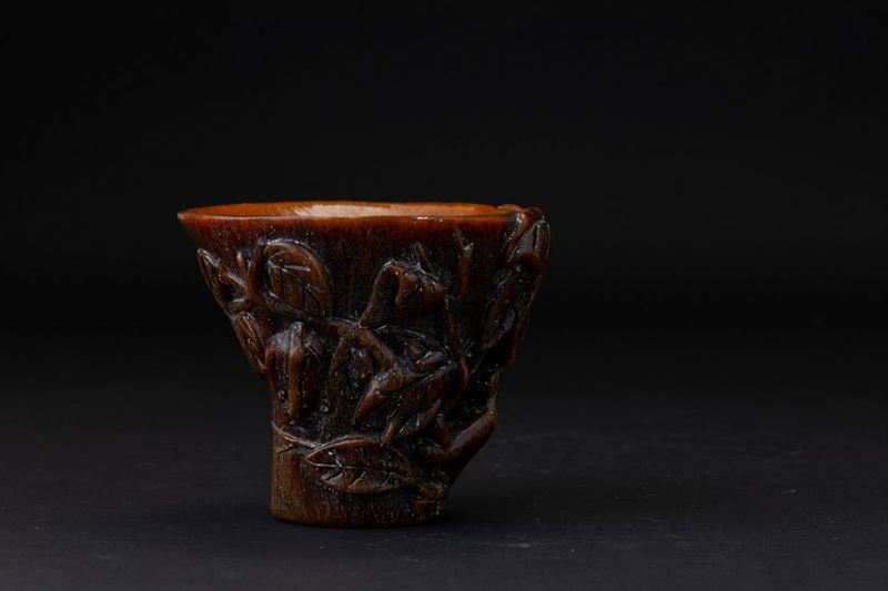 Coppa scolpita in corno con decori vegetali a rilievo, Cina, Dinastia Qing, XIX secolo