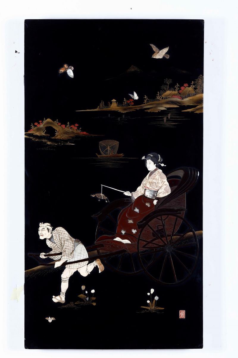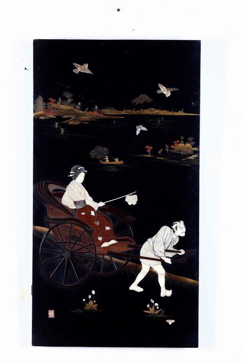 Coppia di pannelli in legno laccato con innesti in avorio, madreperla e pietre dure raffiguranti donna su carretto, Giappone, [..]