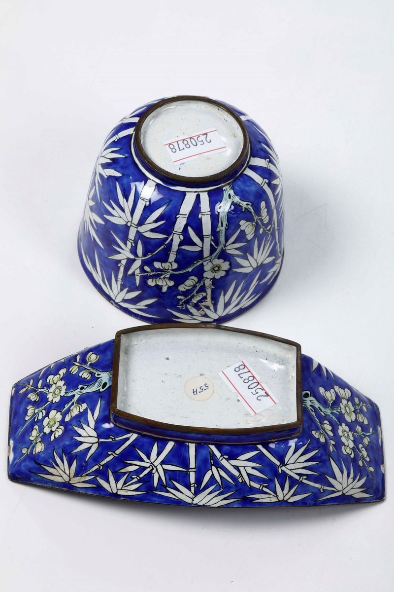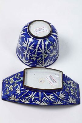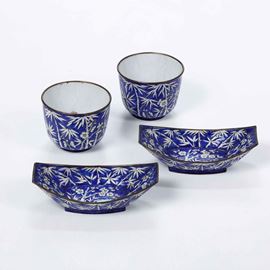 Coppia di tazze con piattini in rame smaltato con decori a canne di bambù su fondo blu, Cina, Dinastia Qing, XIX secolo