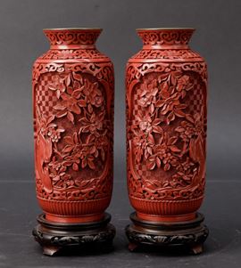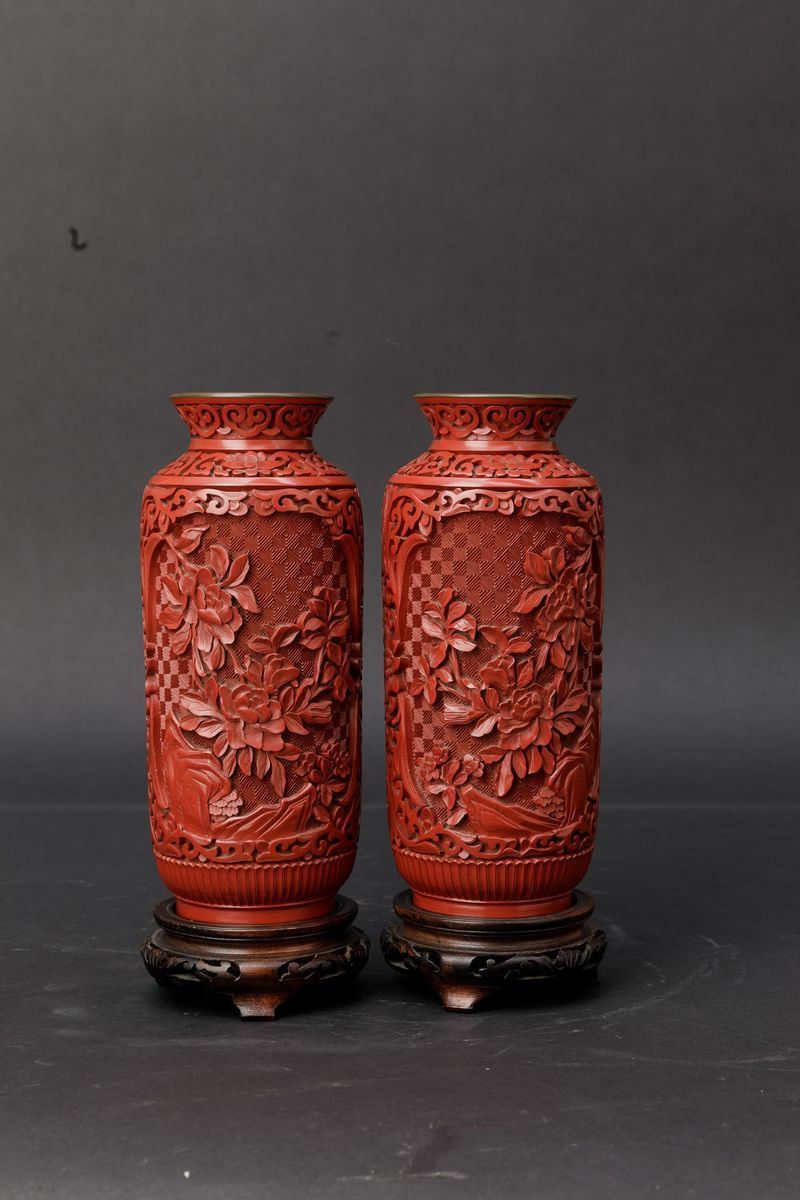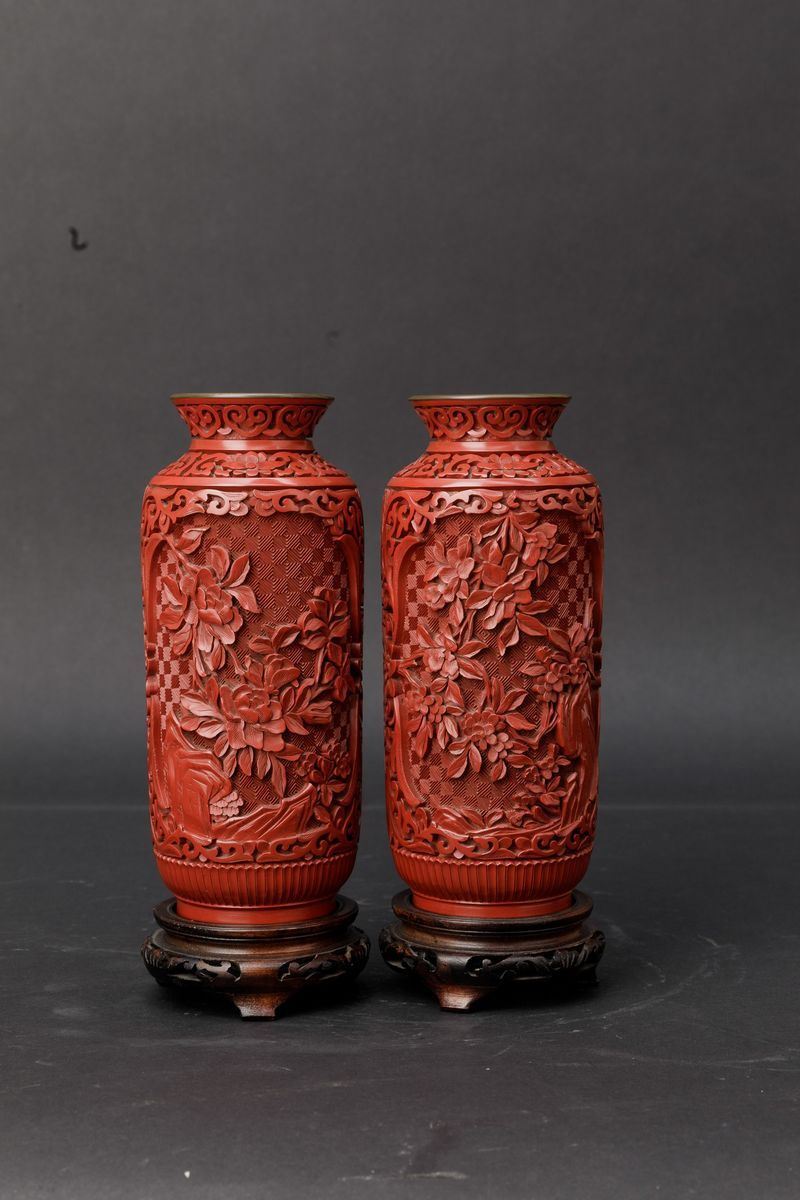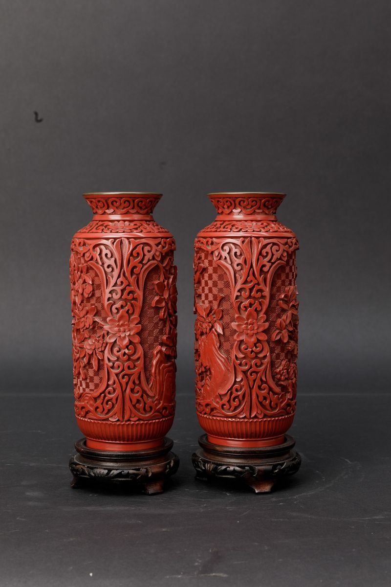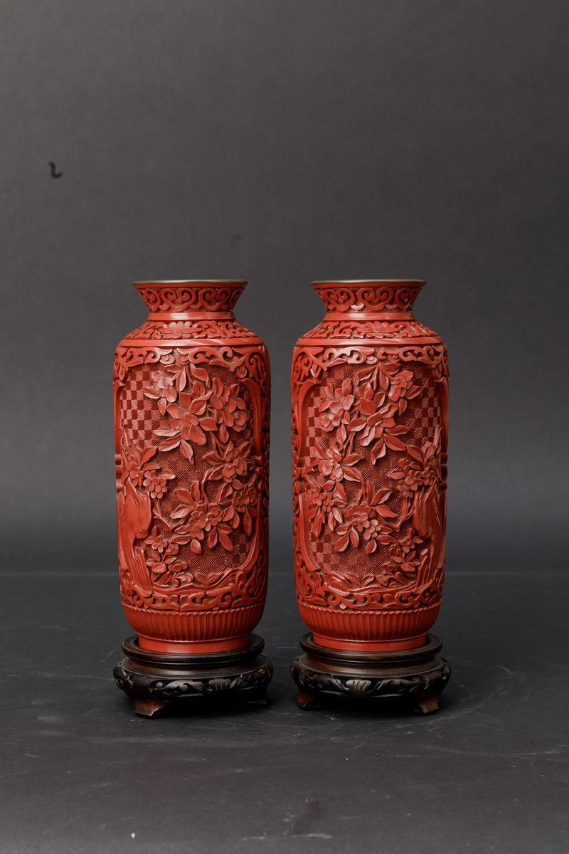Coppia di vasetti cilindrici in lacca con decori naturalistici e floreali a rilievo, Cina, XX secolo