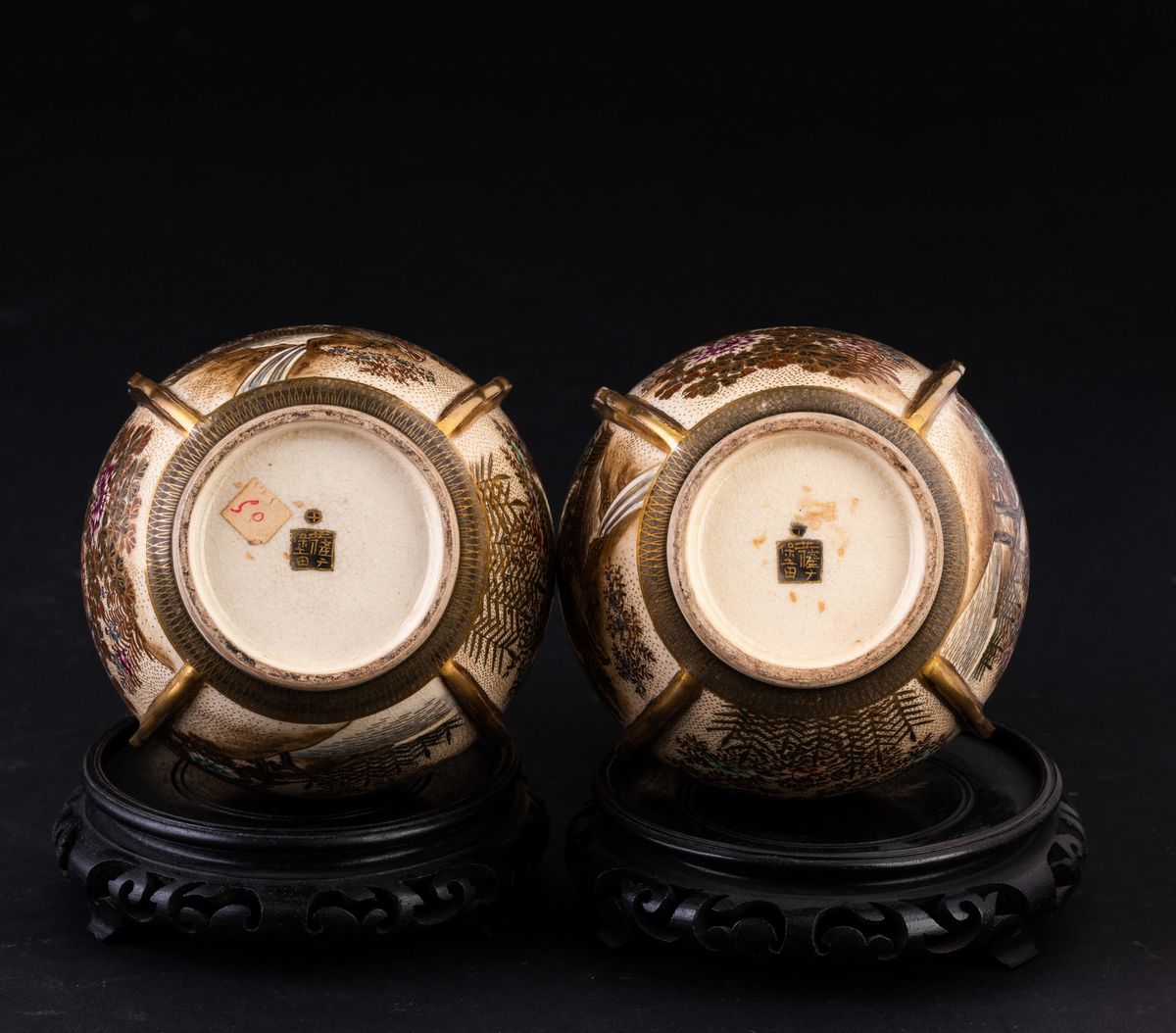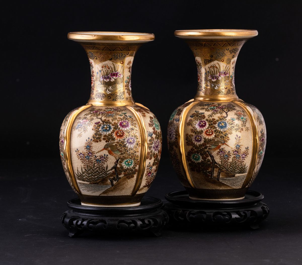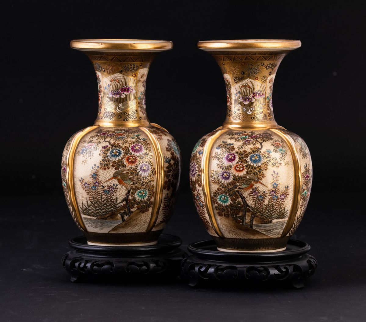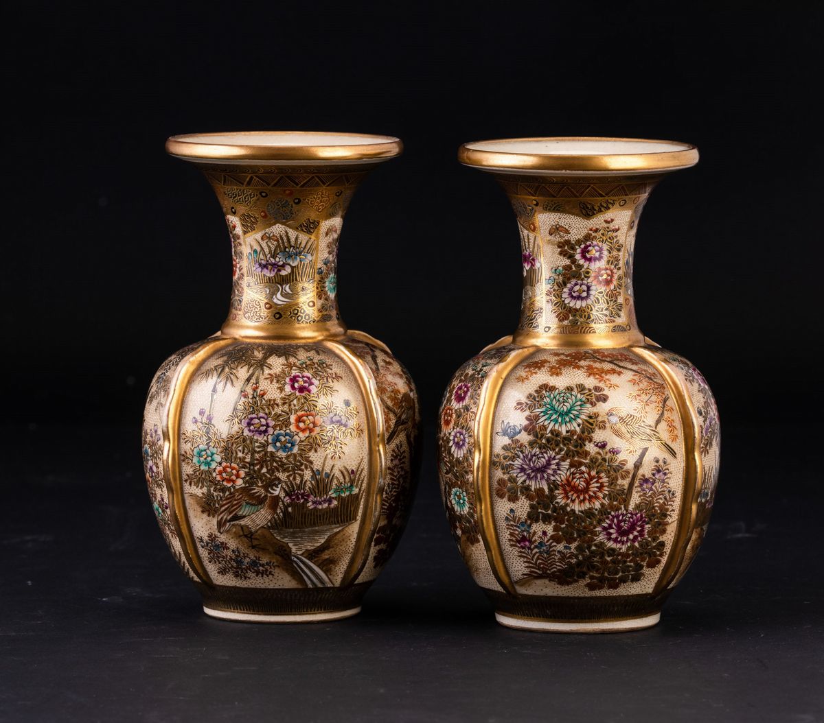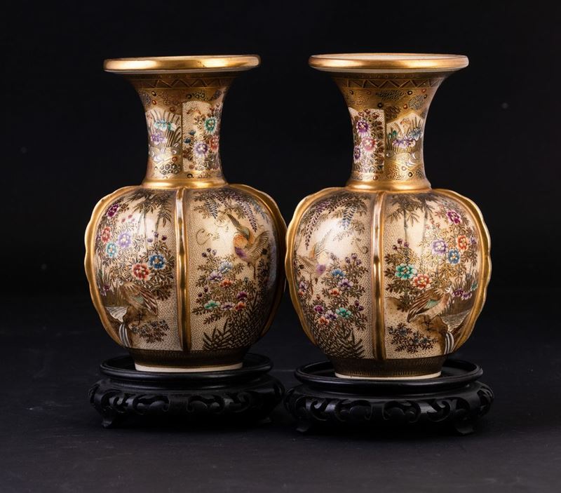 Coppia di vasi in porcellana con decori floreali e soggetti naturalistici entro riserve, Giappone, periodo Meiji (1868-1912)