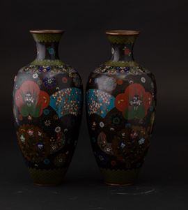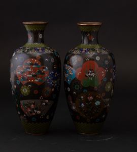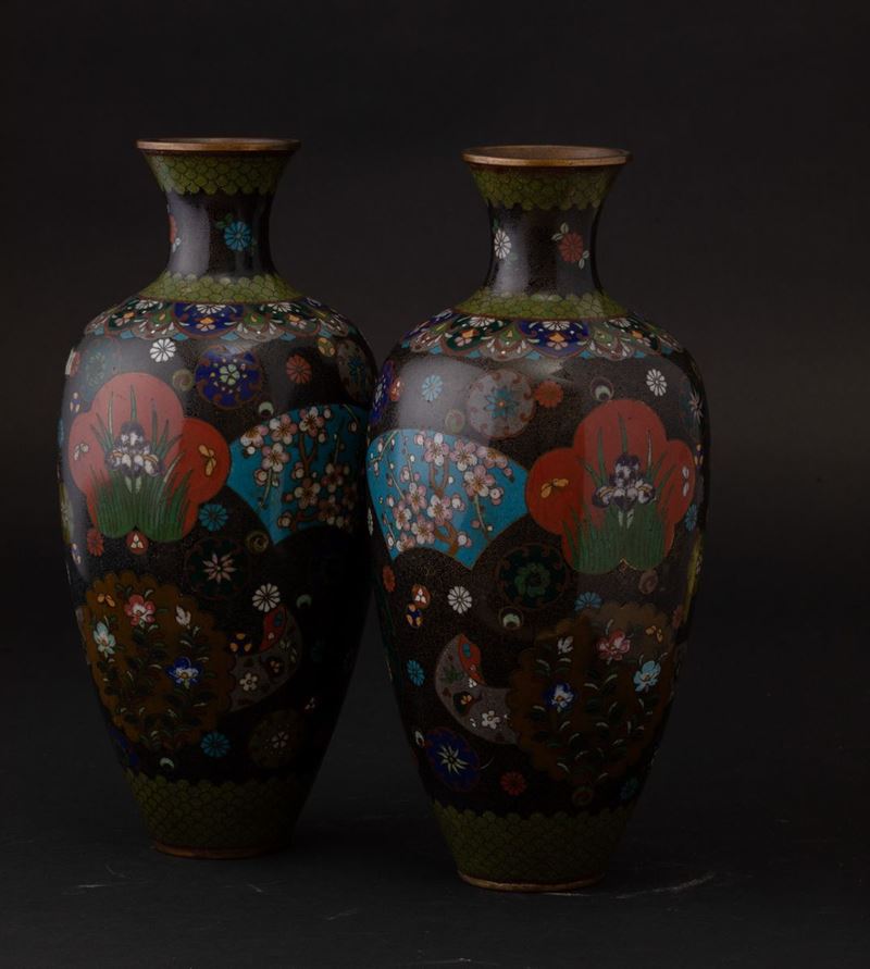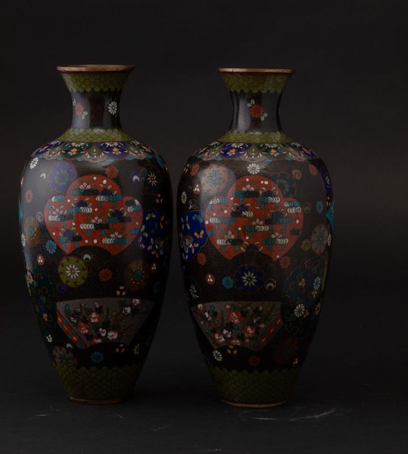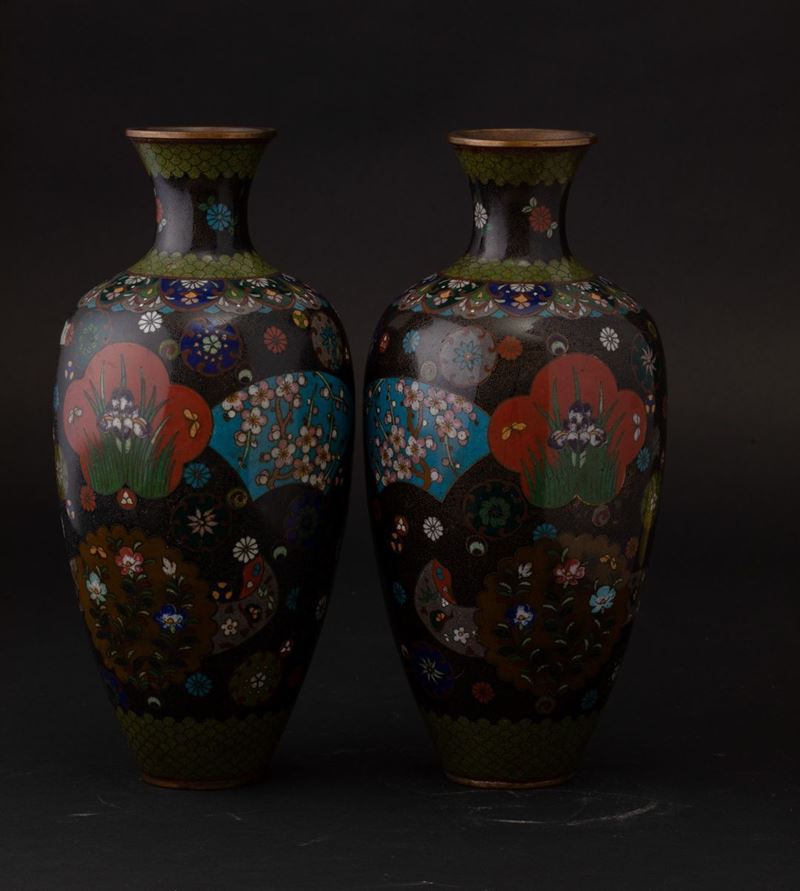 Coppia di vasi in smalto con decori naturalistici entro riserve, Giappone, periodo Meiji (1868-1912)