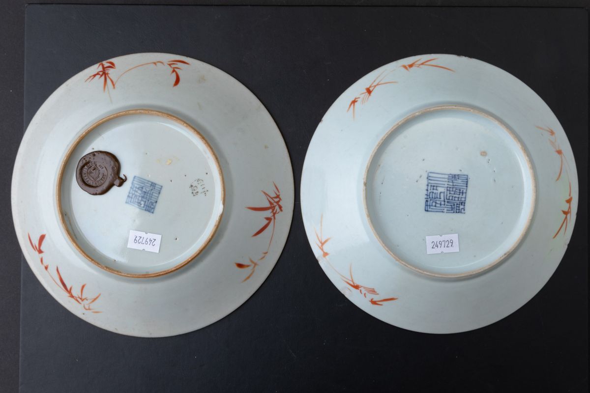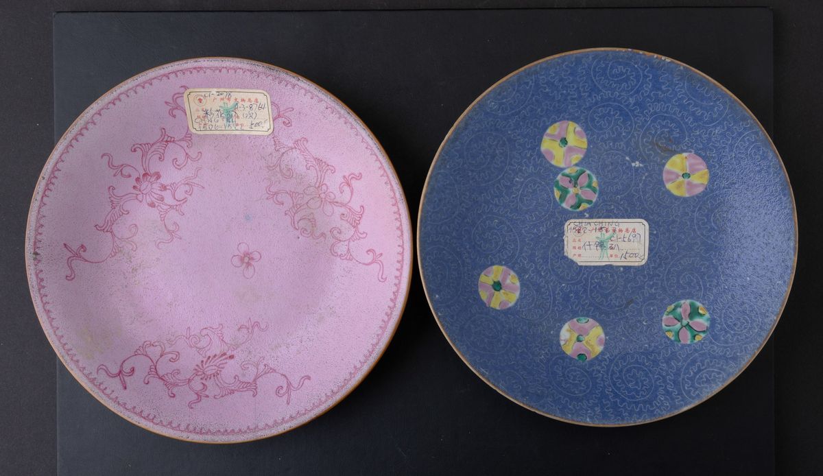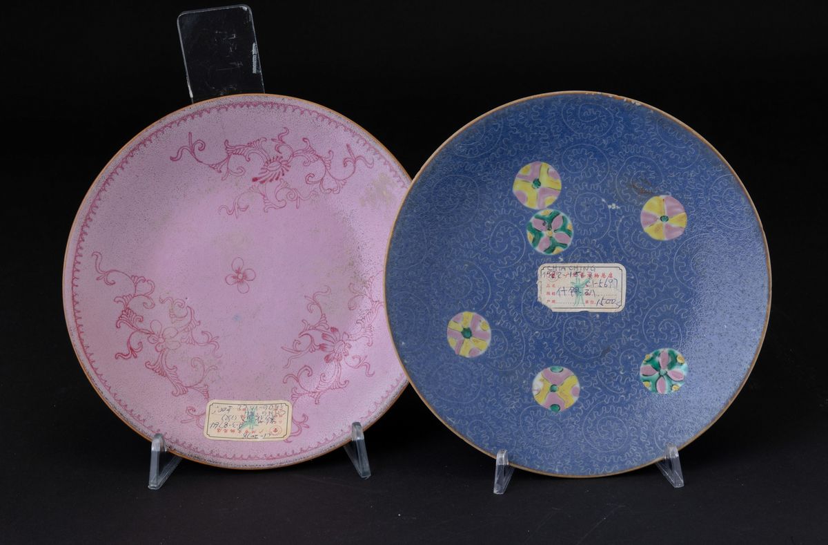Due piattini diversi in porcellana rosa e blu con decori floreali, Cina, Dinastia Qing, XIX secolo