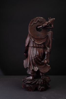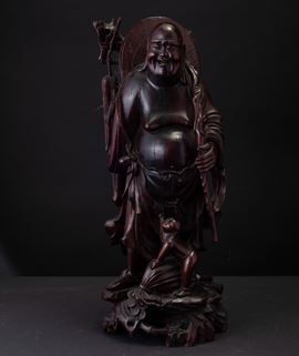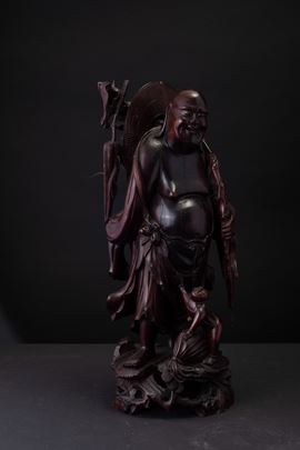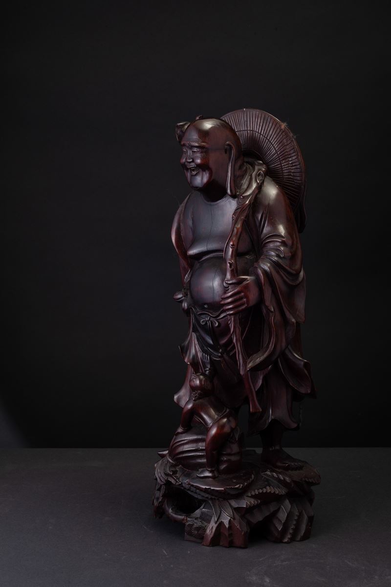 Figura di Budai con discepolo scolpita in legno, Cina, XX secolo