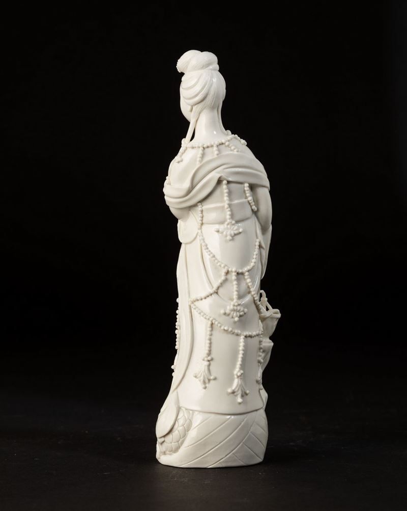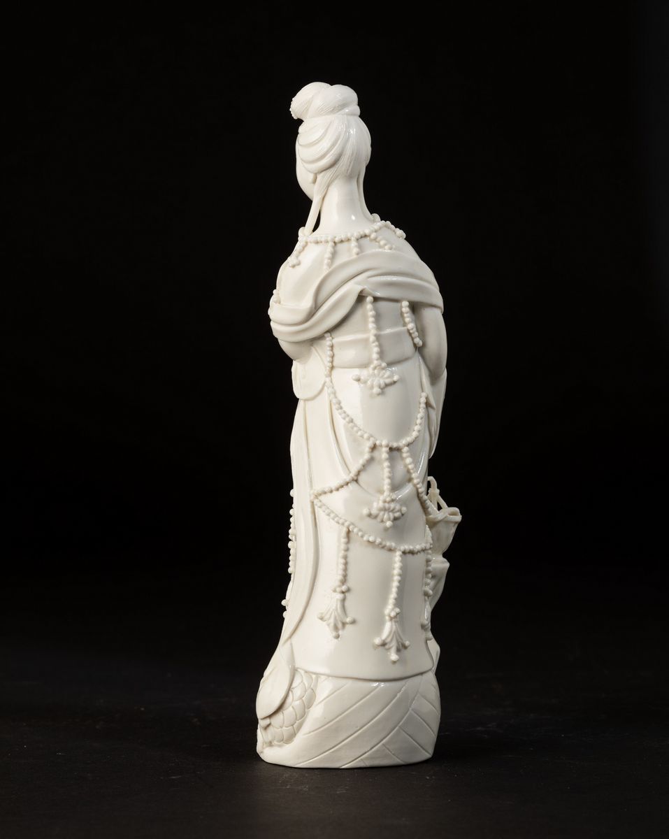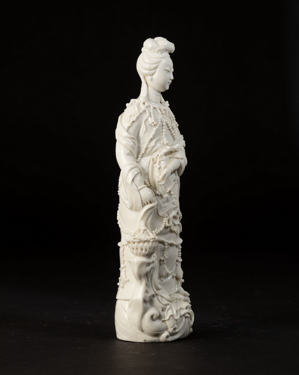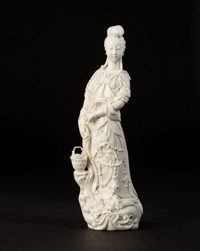 Figura di Guanyin in porcellana Blanc de Chine con cesto, Cina, XX secolo