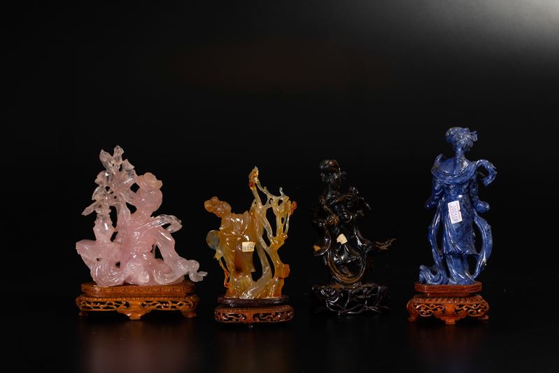 Lapis lazuli, tiger's eye, pink quartz and agate. H from 13.5cm to 16cm