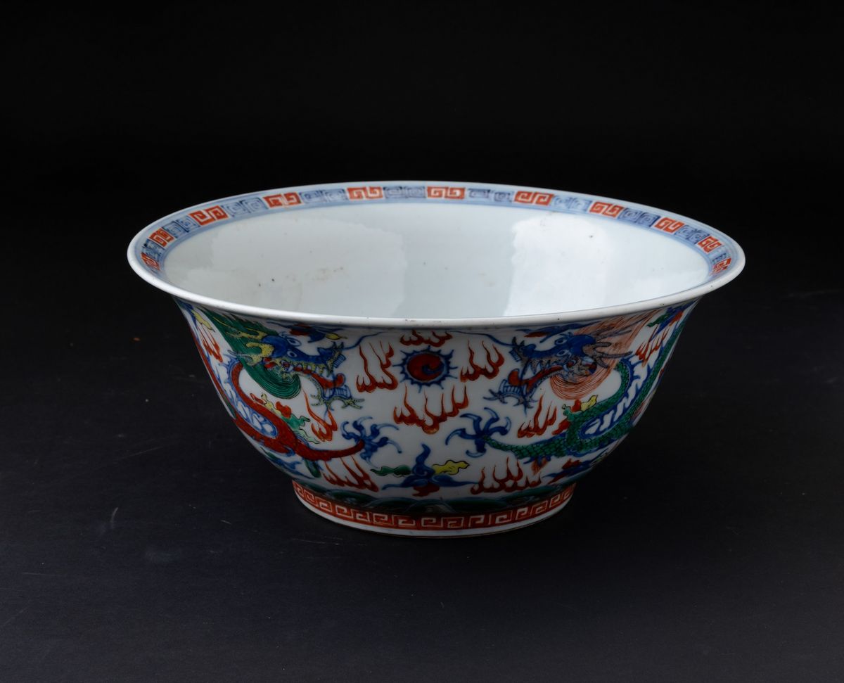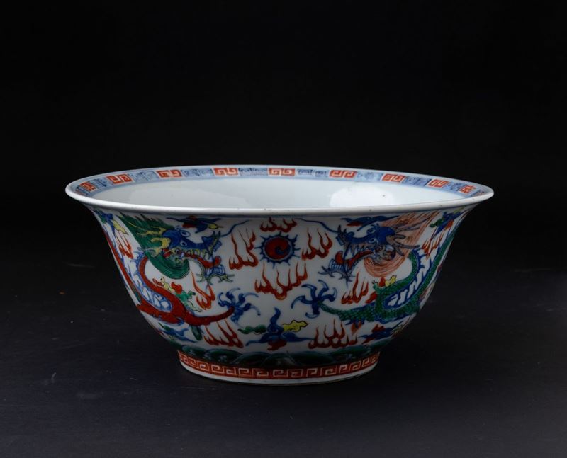 Grande bowl in porcellana con decoro di draghi tra le nuvole, Cina, Dinastia Qing, XIX secolo