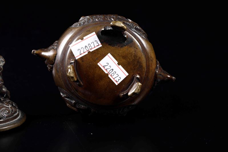 Incensiere tripode in bronzo con soggetti naturalistici entro riserve e presa del coperchio a foggia di draghetto, Giappone, [..]