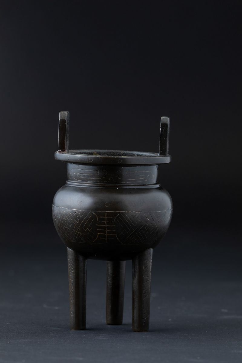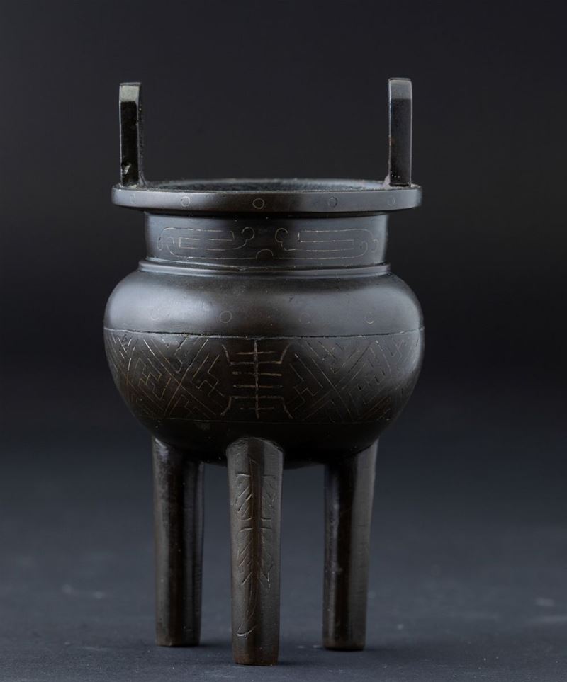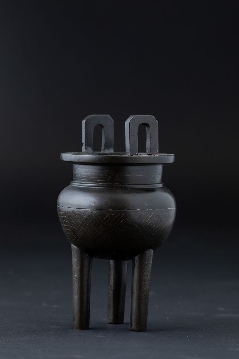 Incensiere tripode in bronzo niellato in argento con decori d'ispirazione arcaica, Cina, Dinastia Ming