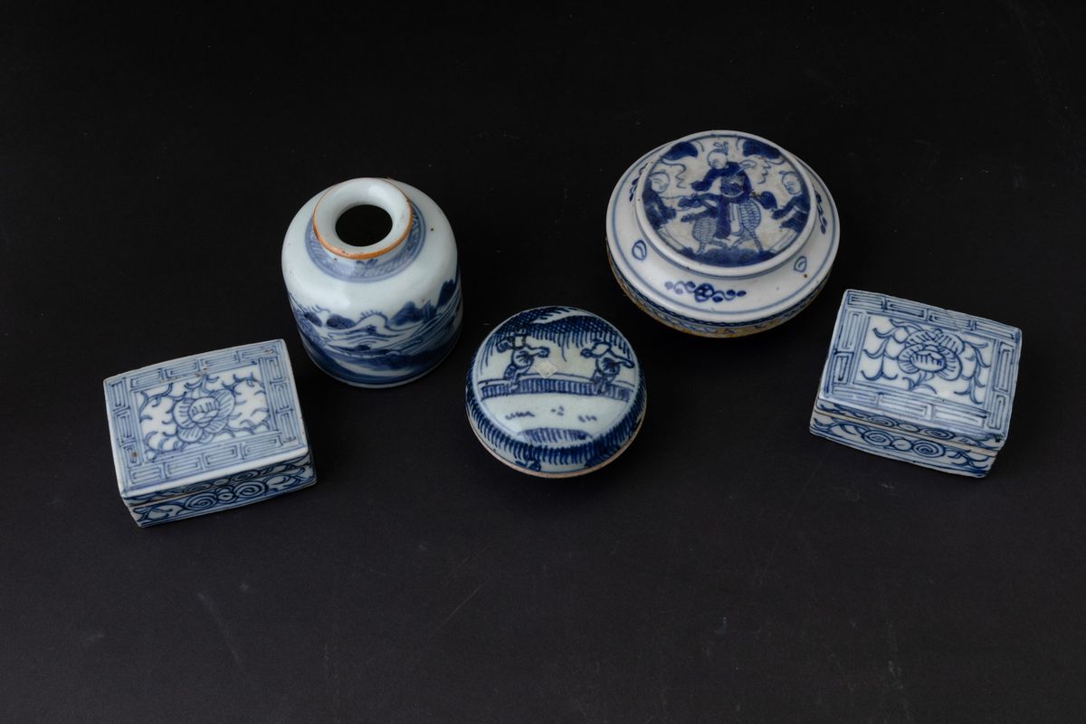 Lotto composto da quattro scatole e un vasetto in porcellana bianca e blu, Cina, Dinastia Qing, XVIII-XIX secolo