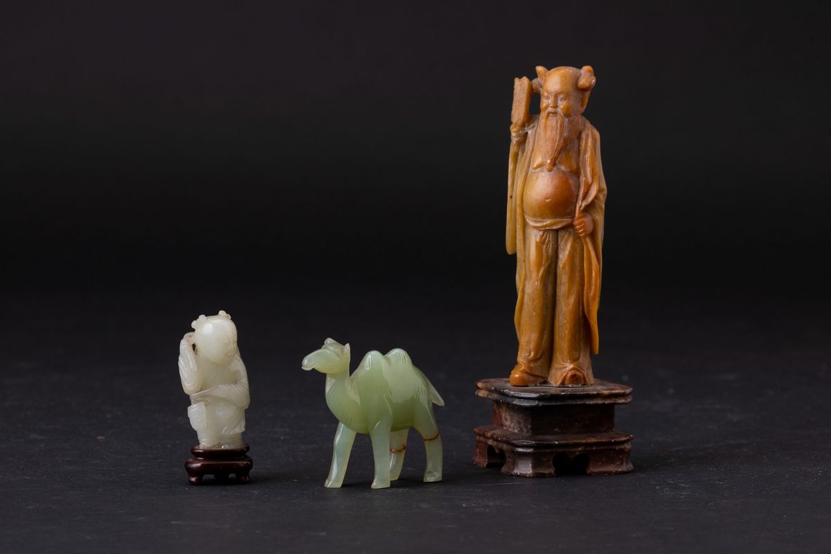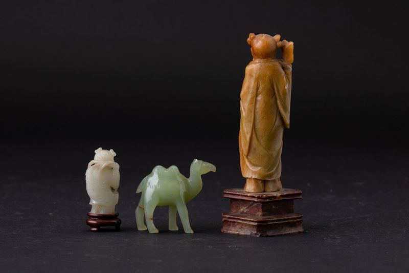 Lotto composto da una figura di saggio in saponaria e una figura di cammello in giada, Cina, XX secolo