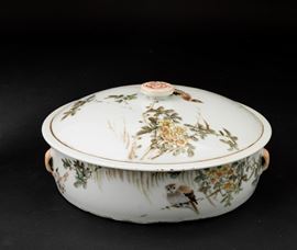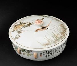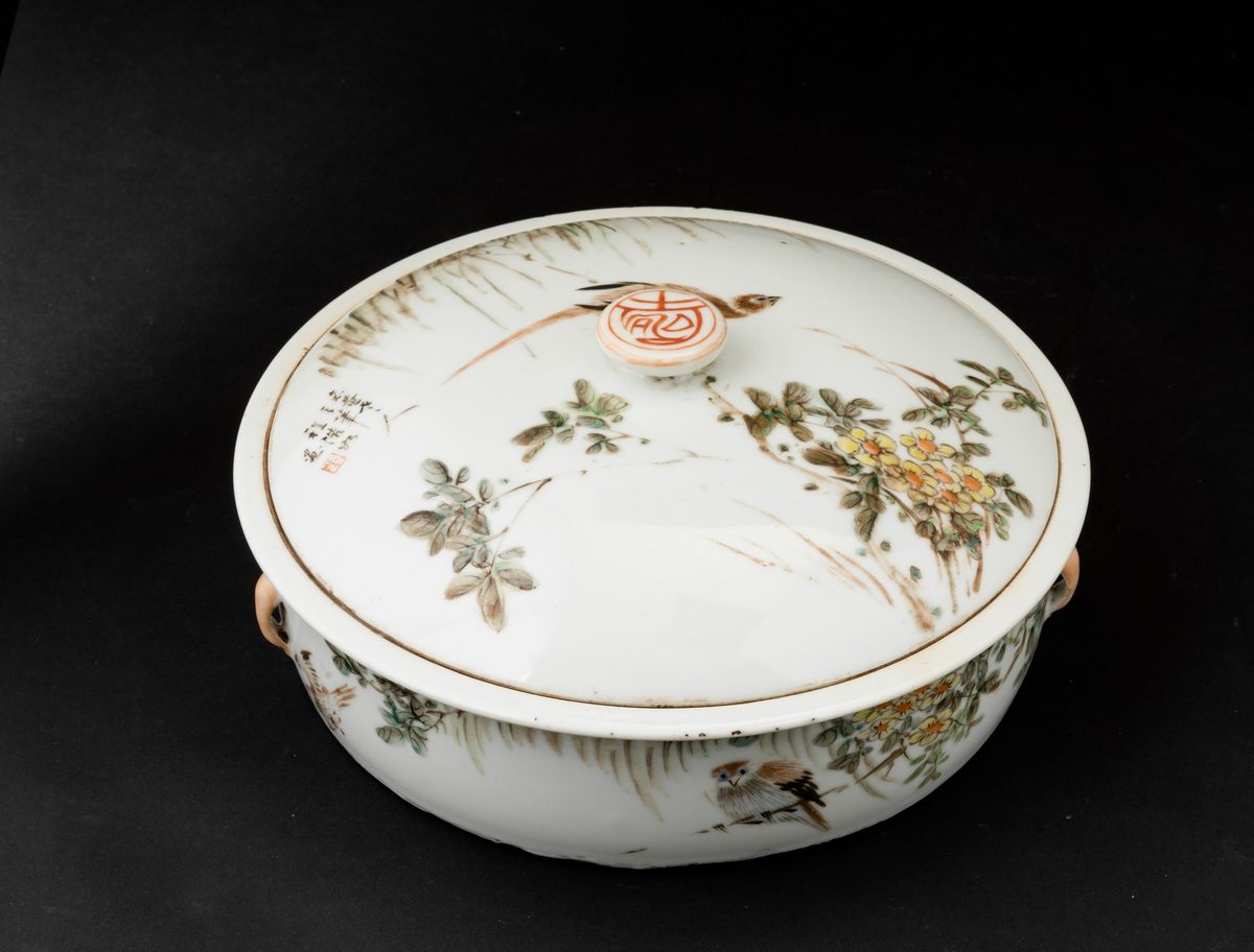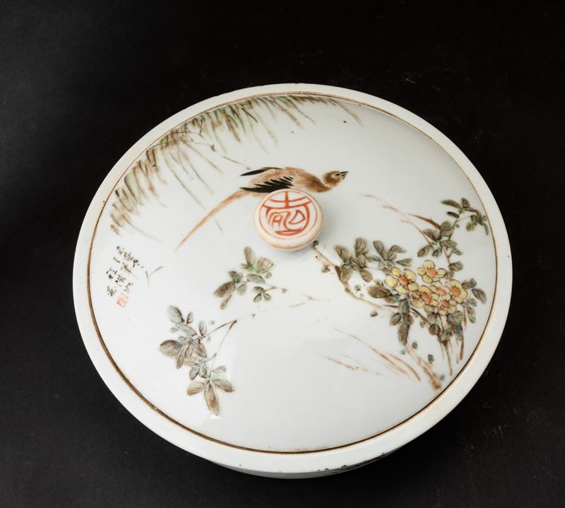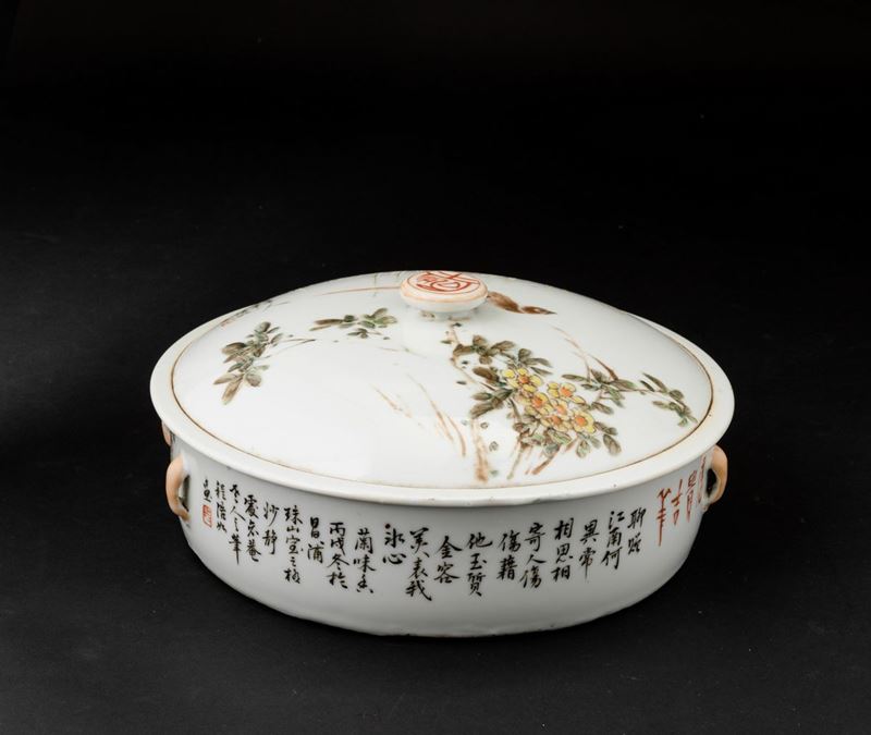Scatola con coperchio in porcellana con iscrizioni e decori naturalistici, Cina, Dinastia Qing, XIX secolo