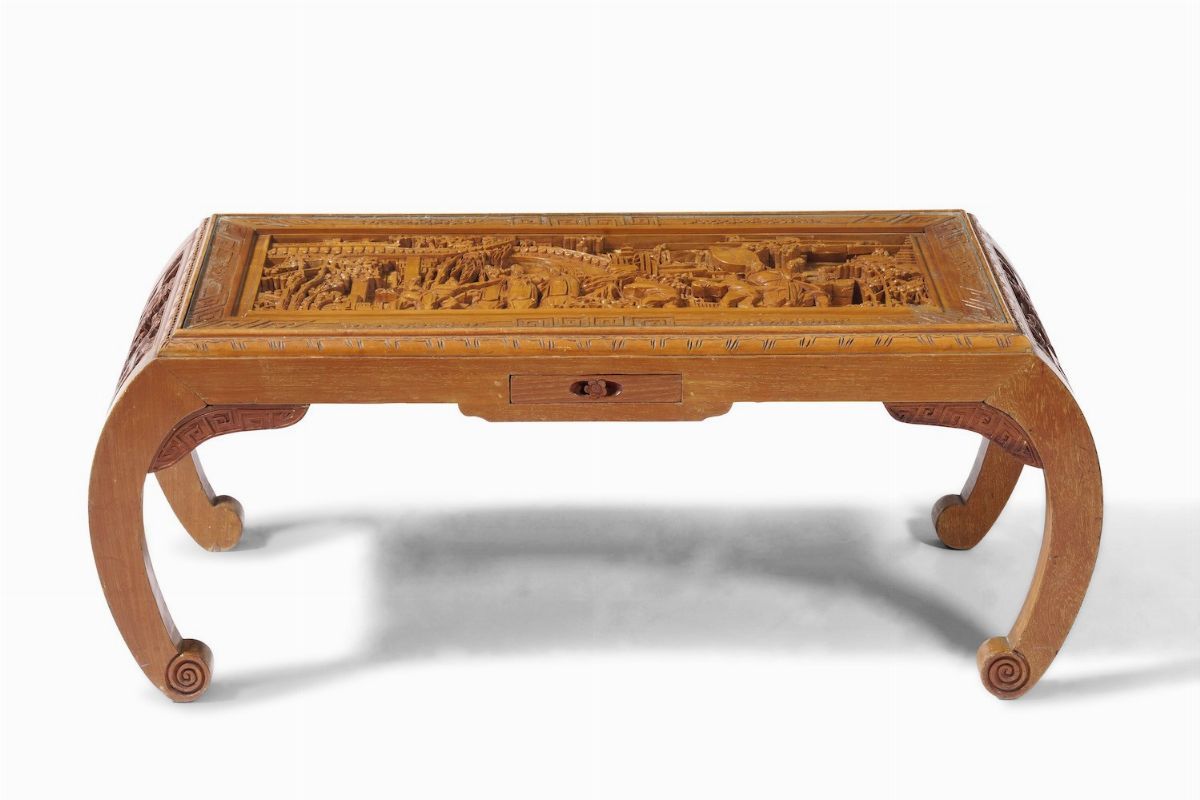 Tavolo basso scolpito in legno con piano decorato a traforo, Cina, XX secolo