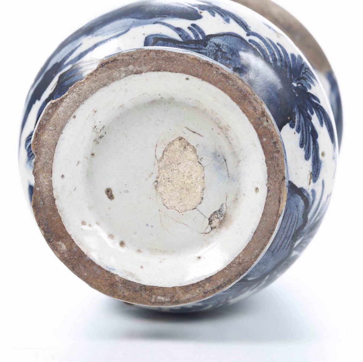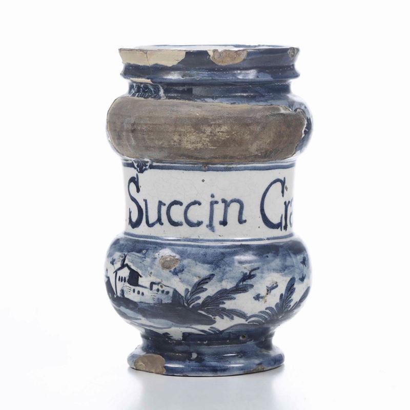 Maiolica. Marca assente. Altezza cm 18,7. Conservazione: sbeccature e cadute di smalto
