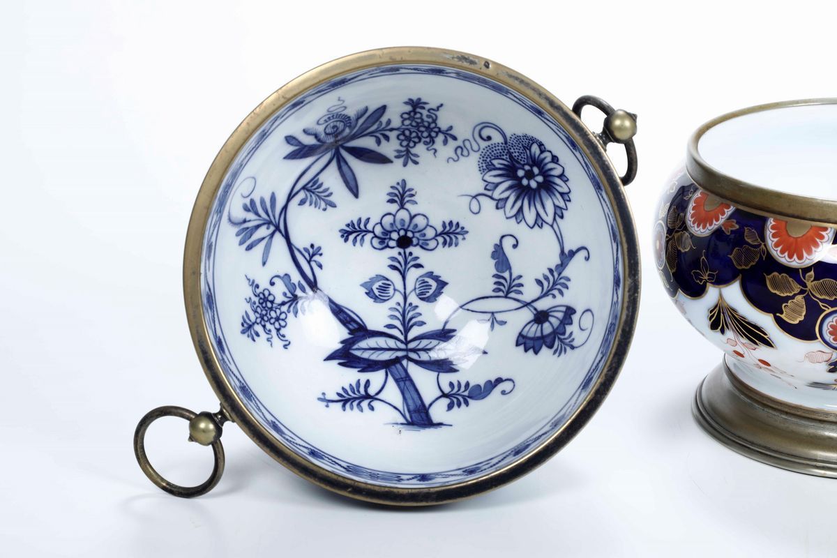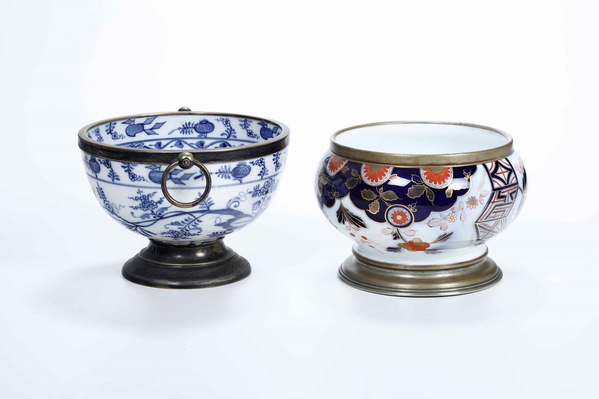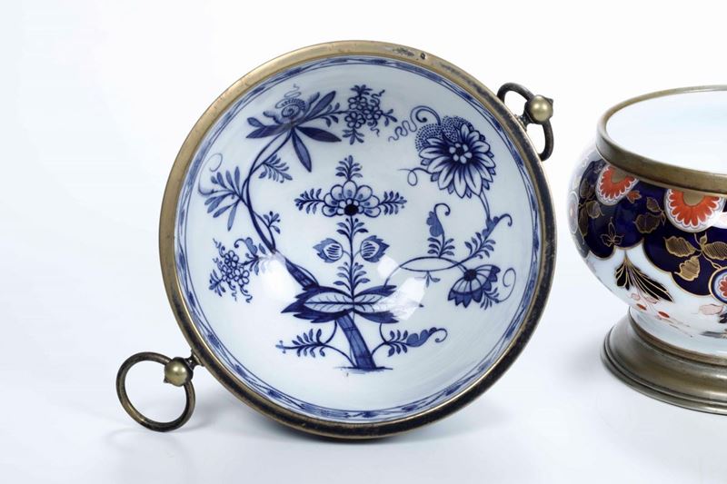 Porcellana con montature in metallo. Marca assente. Dimensioni: altezza massima cm 16,5 circa; diametro cm 24 circa. Conservazione: ottima