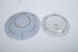 Maiolica policroma a gran fuoco. Marca assente. Diametro: cm 23,2; cm 19,2. Conservazione: piatto al carabiniere con piccole sbeccature al bordo; l'altro rotto in due frammenti e ricomposto