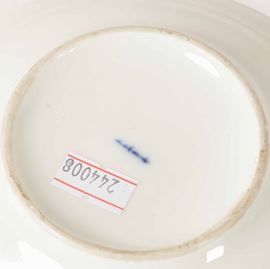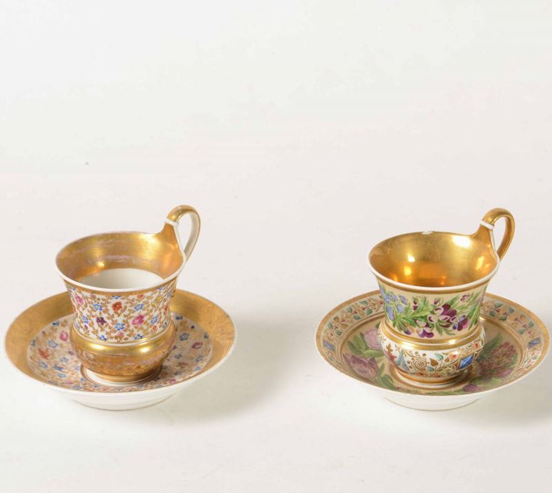 Porcellana. Marca: "KPM" e scettro in blu. Dimensioni: altezza tazza cm 9,4; diametro piattino cm 14,5. Conservazione: una tazza con piccola sbeccatura al bordo; leggere usure all'oro