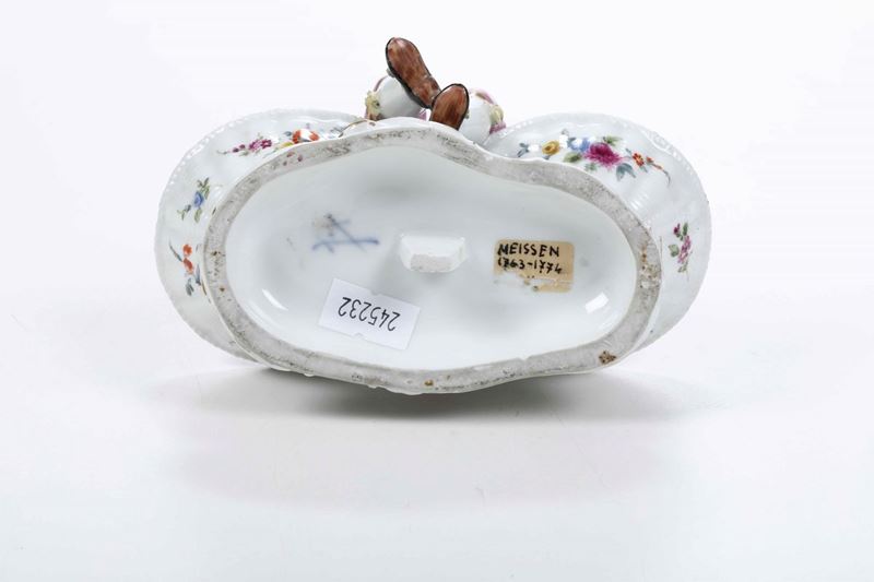 Porcellana policroma. Marca: spade con punto tra le else, in blu. Dimensioni: altezza cm 13; cm 13,7x8,5. Conservazione: ottima; minime mancanze ai nastri