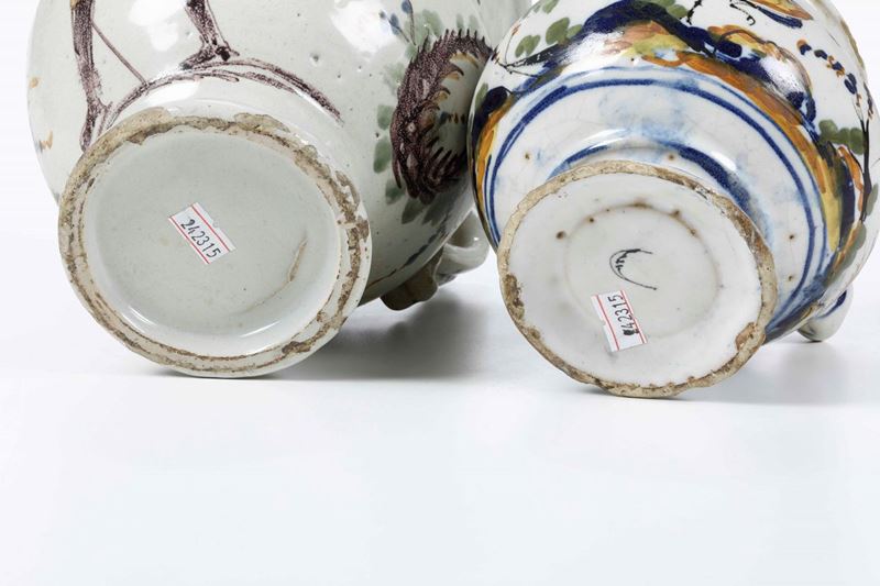 Maiolica policroma a gran fuoco. Marca: boccale versatoio con "luna". Altezza cm 19,5; cm 17. Conservazione: buona; minime sbeccature