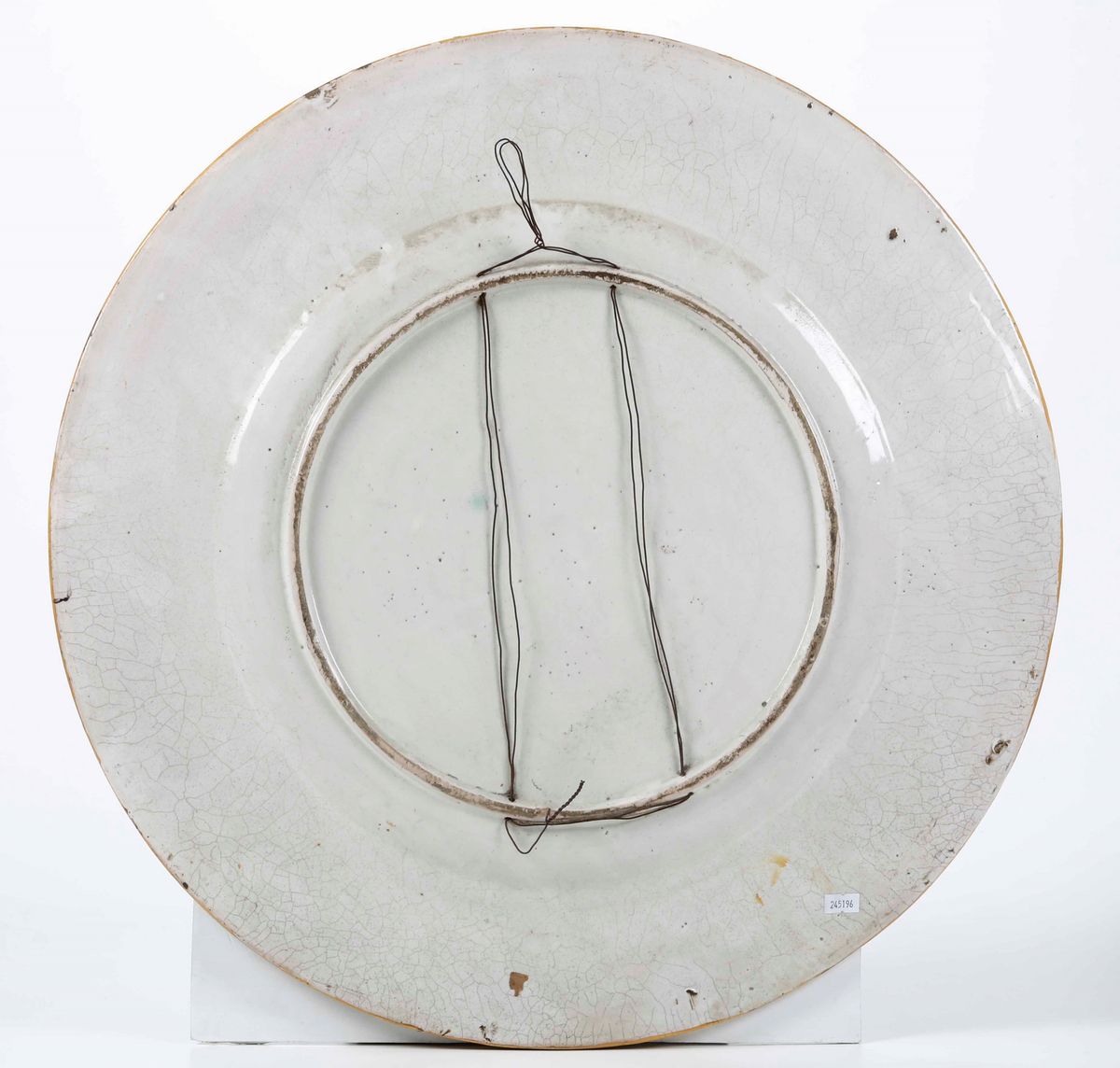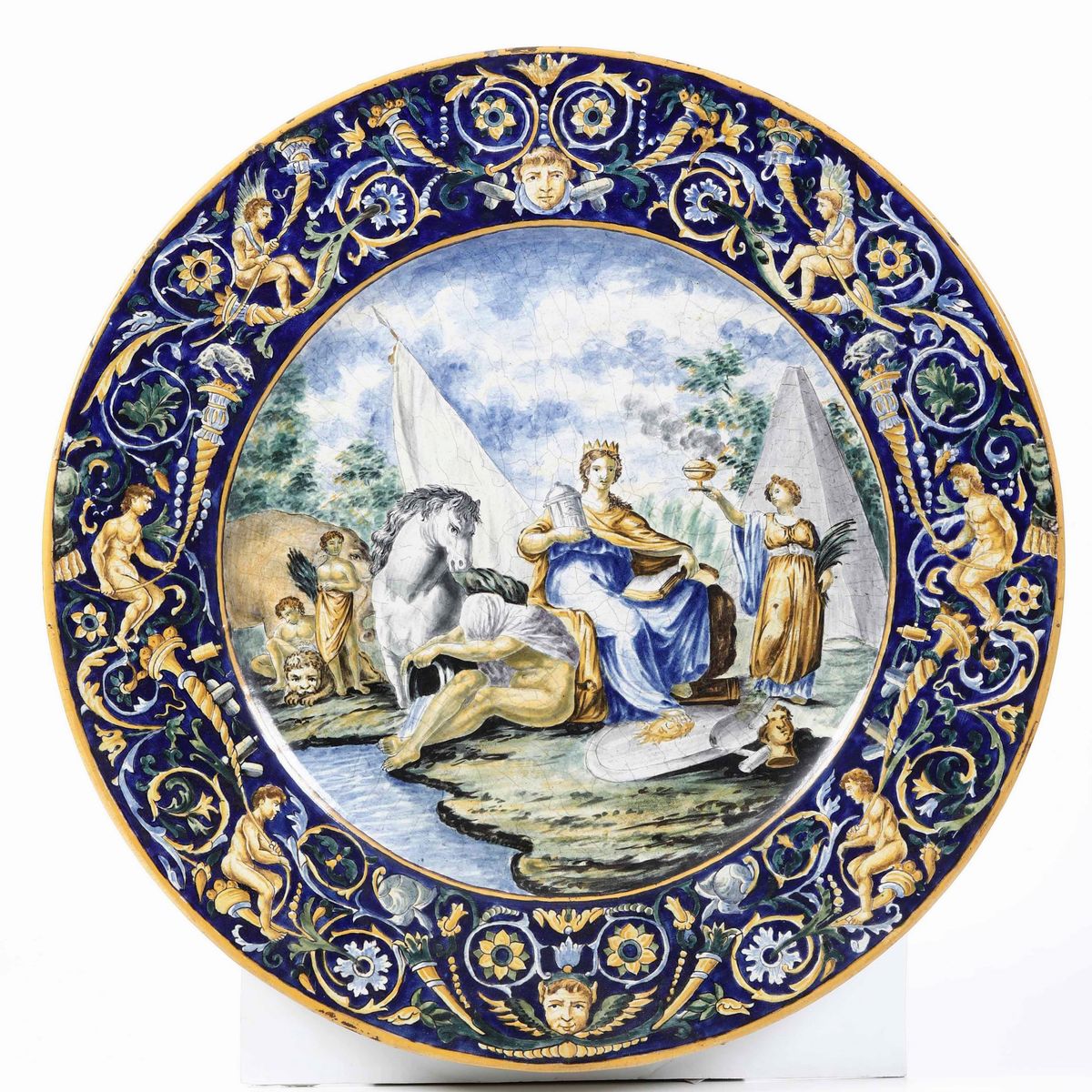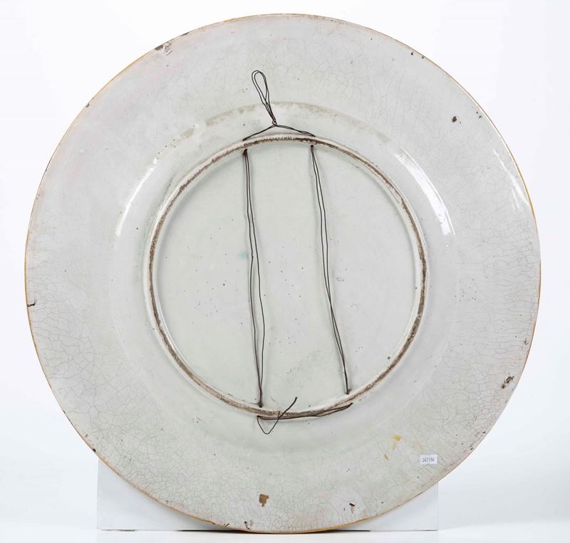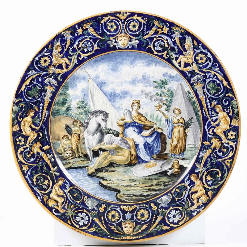 Maiolica policroma decorata a gran fuoco con scene mitologiche. Marca assente. Diametro cm 62. Conservazione: qualche sbeccatura al bordo