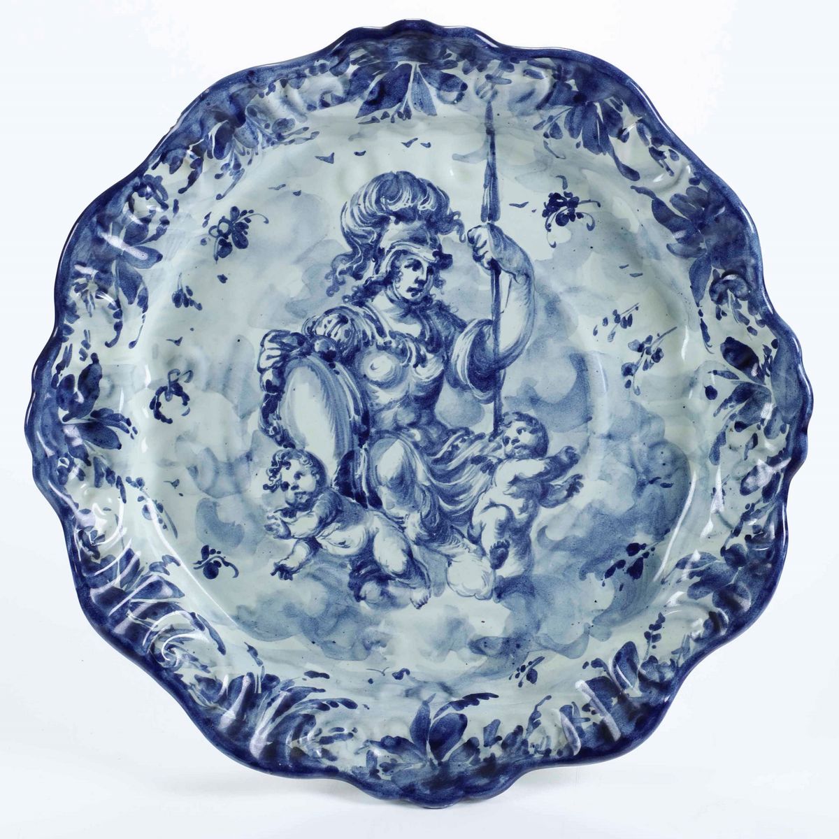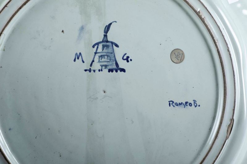 Maiolica decorata in monocromia blu. Marca: torre con lettere "MG"; "Romeo B." in blu. Diametro cm 35. Conservazione: ottima; insignificanti sbeccature