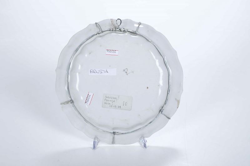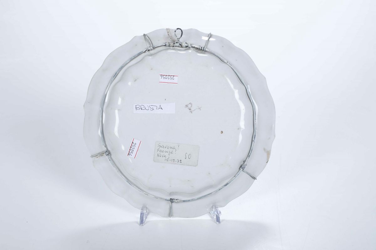 Maiolica decorata in verde e manganese. Marca: "P" e due croci in manganese. Diametro cm 23. Conservazione: felatura sulla tesa