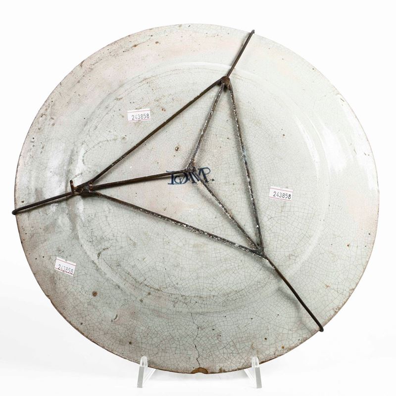 Maiolica monocroma blu. Marca: "DGAVP." in blu. Diametro cm 34,5. Conservazione: craquelures; un felatura e piccole sbeccature e usure al bordo