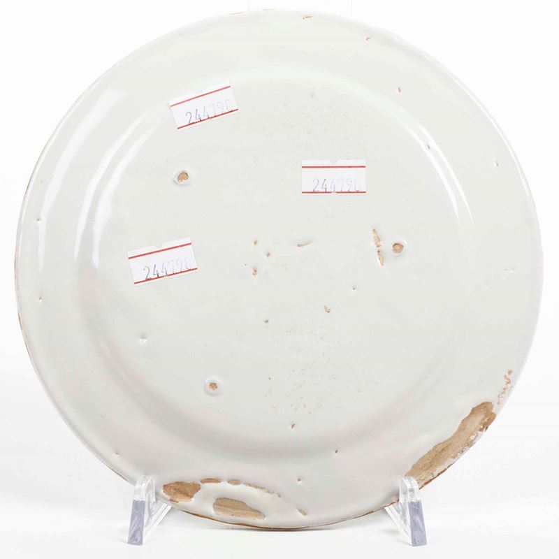 Maiolica policroma. Marca assente. Diametro cm 17,5. Conservazione: rotto in più frammenti e ricomposto in restauro
