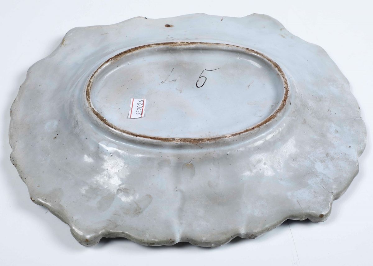 Maiolica a gran fuoco. Marca assente. Dimensioni: cm 29x24,5. Conservazione: due sbeccature al bordo