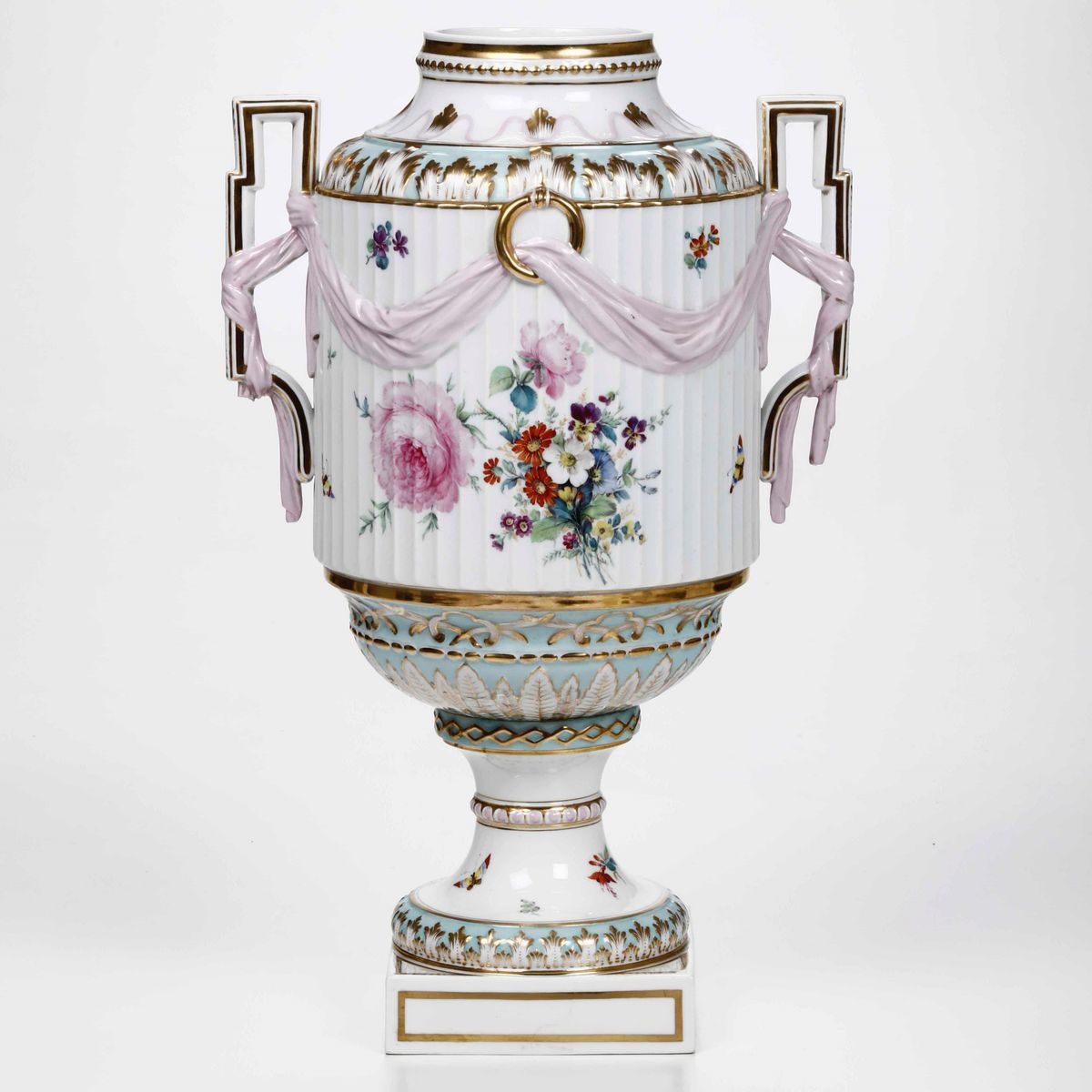 Porcellana dipinta in policromia e dorata. Marca: scettro in blu; lettere "F H" impresse. Altezza cm 45. Conservazione: un lembo del nastro mancante; incollatura all'interno del piede non visibile esternamente; insignificante felatura al bordo della base