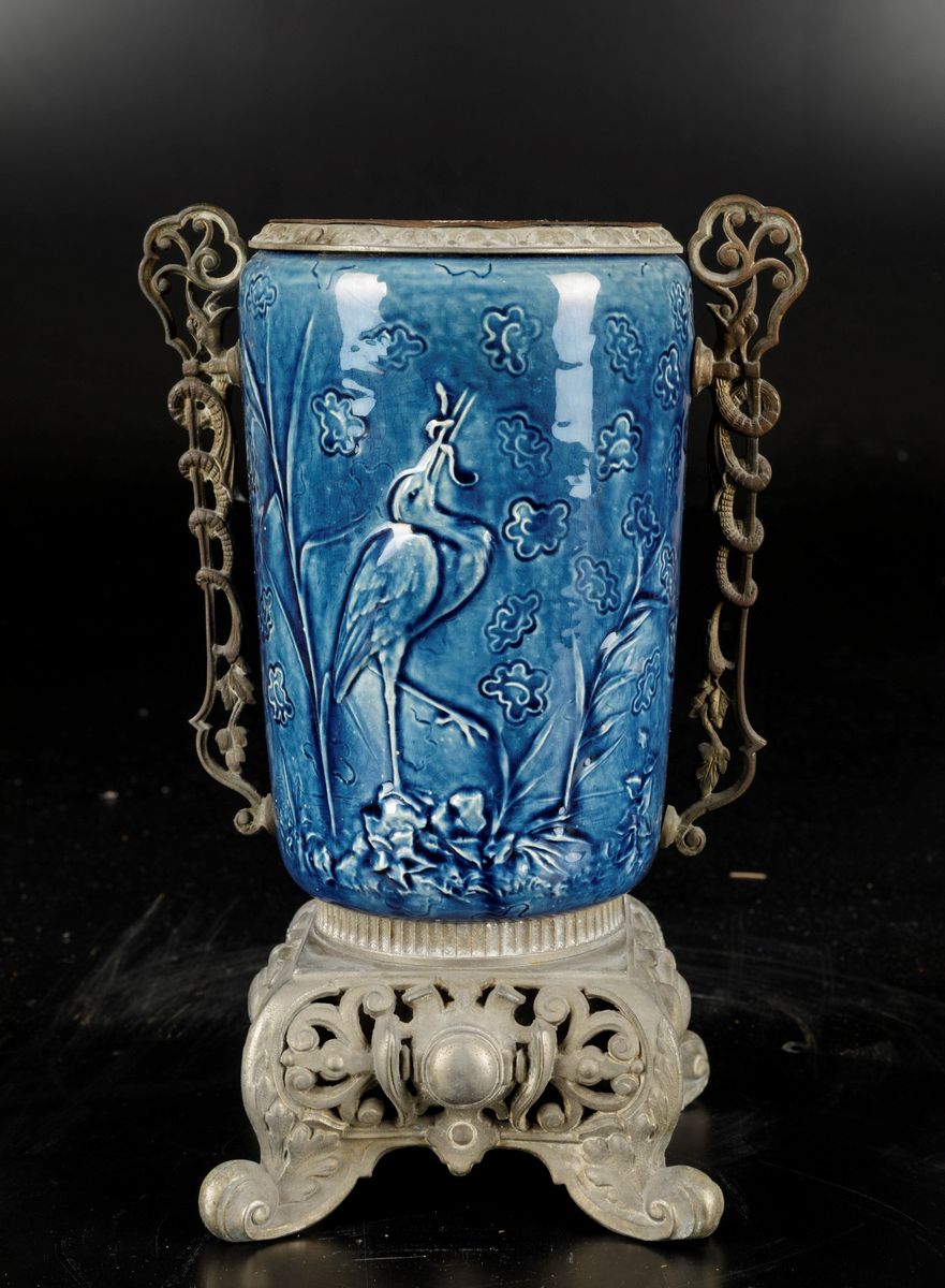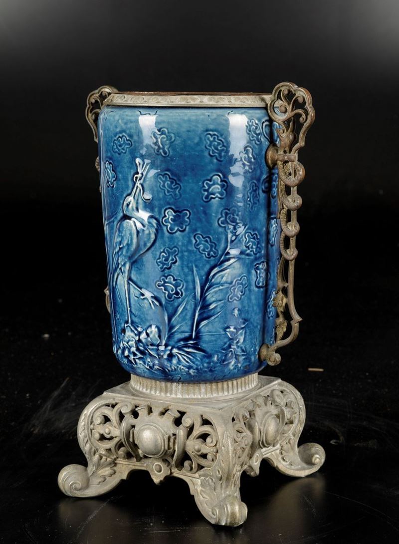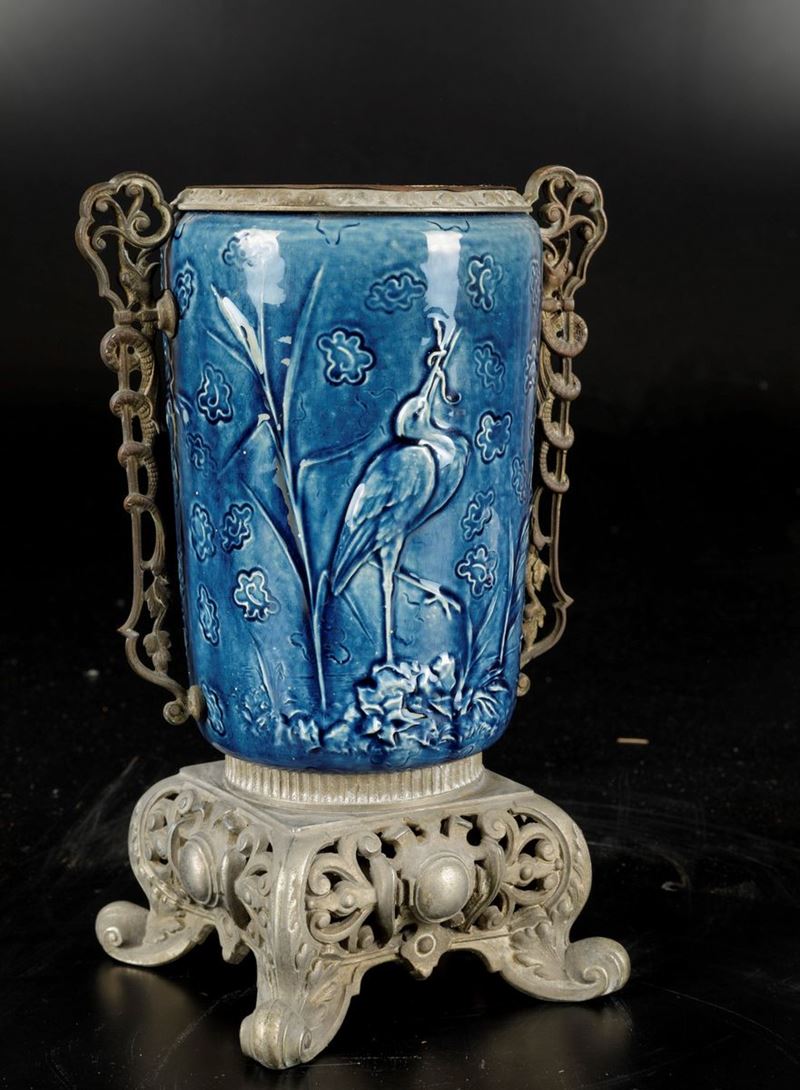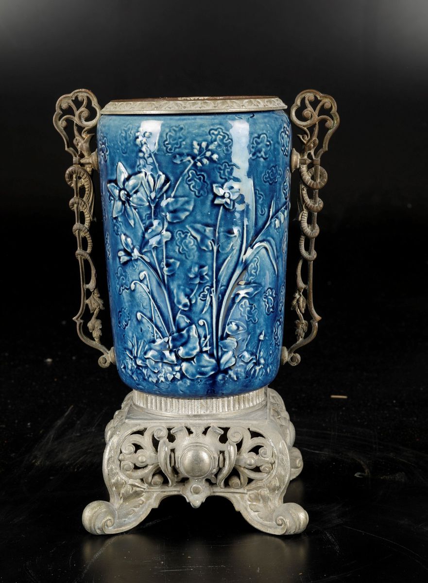 Grès a smalto monocromo azzurro con decori naturalistici a rilievo e montatura in bronzo e lega di metallo. Altezza totale cm 28,5. Marca: non visibile. Conservazione: ottima