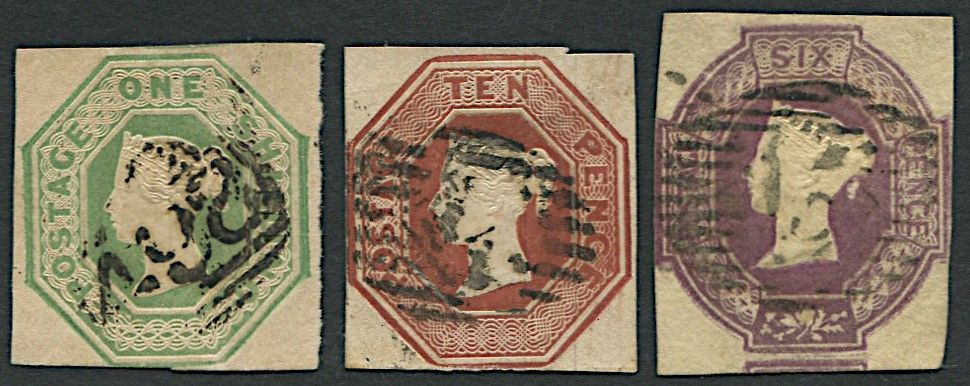 6 d., 10 d. and 1 s., imperforated (S.G. 56, 57, 59). Some margins just clear. 6 d. shaved at left. Good colours.