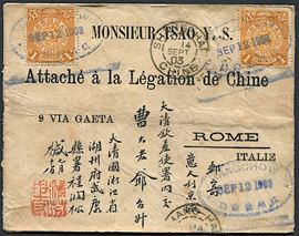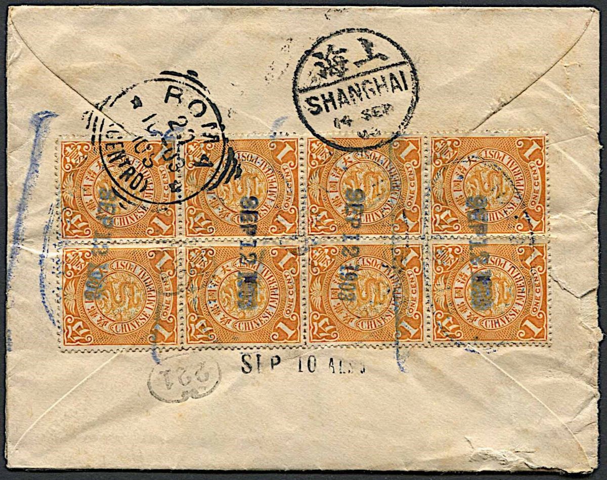 Envelope from Hangchow (Hangzhou) to Rome, 12 Sept. 1903, franked with 1 c. two examples on the front (Yv. 47) and a block of eight on the back. Via Shanghai 14 Sept. Very fine.