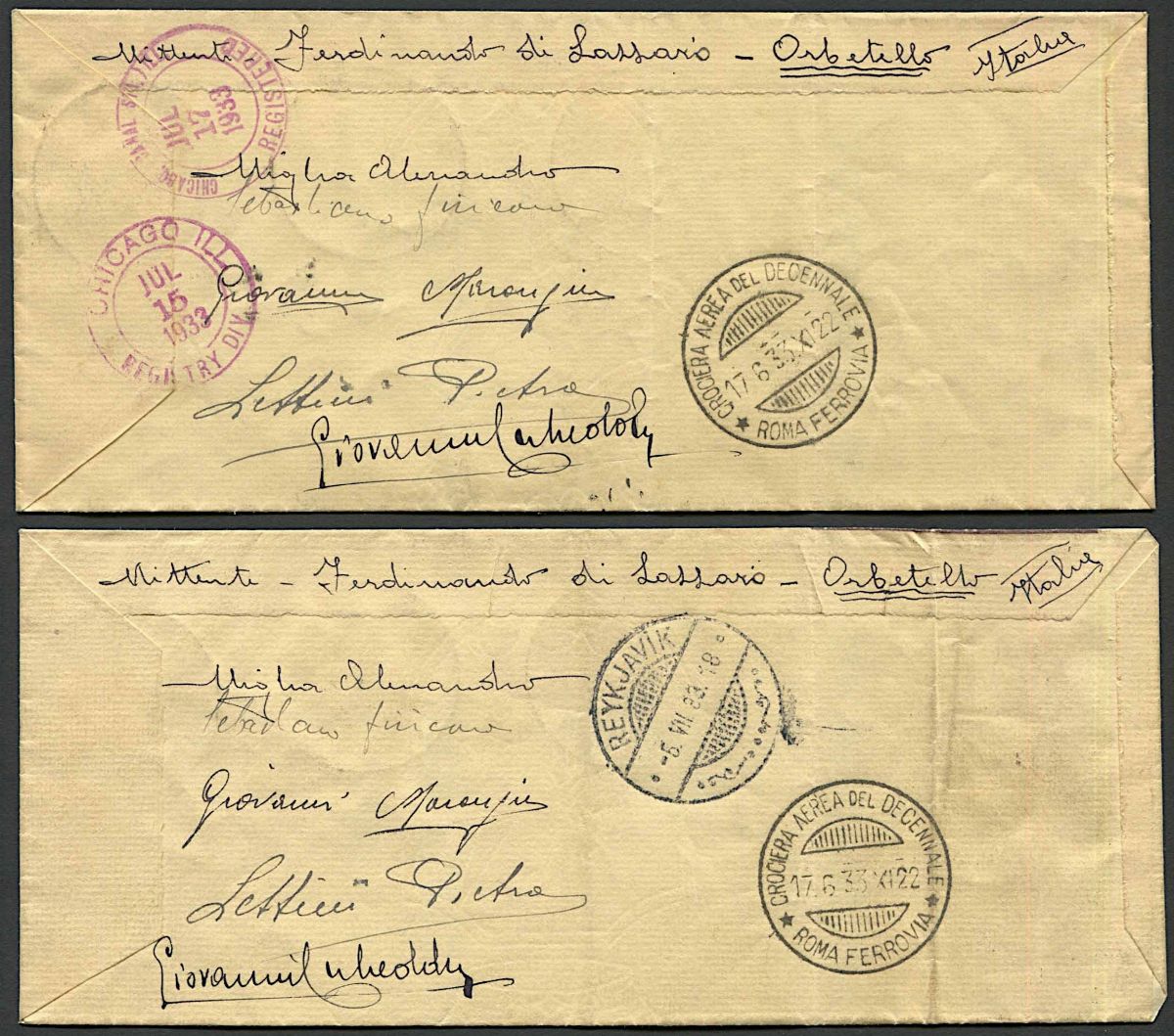 Entrambi da Roma Ferrovia/Orbetello, il primo affrancato con trittico da 44,75 + 5,25 lire, sigla I-MIGL (S.P.A. 52K) per Chicago, perfetto. Il secondo, per Reichiavik, affrancato con trittico da 19,75 + 5,25 lire, sigla I-Dini (S.P.A. 51F) con piega che attraversa la parte sinistra del francobollo. Entrambi con i bolli di arrivo e, al verso, con le firme dei piloti A. Miglia e Sebastiano Fisicaro, del motorista Pietro Lettini e del radiotelegrafista Giuseppe Cubeddu, facenti parte della Seconda Squadriglia “Nero Cerchiata”. Rari documenti.