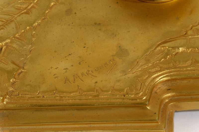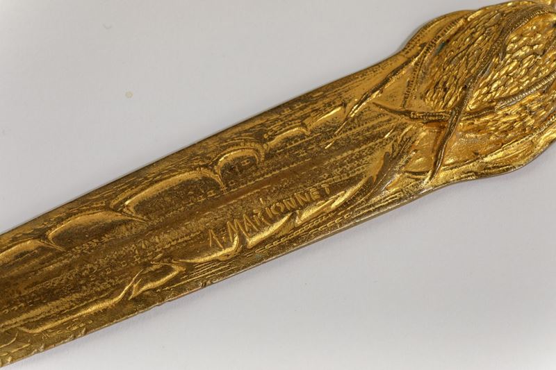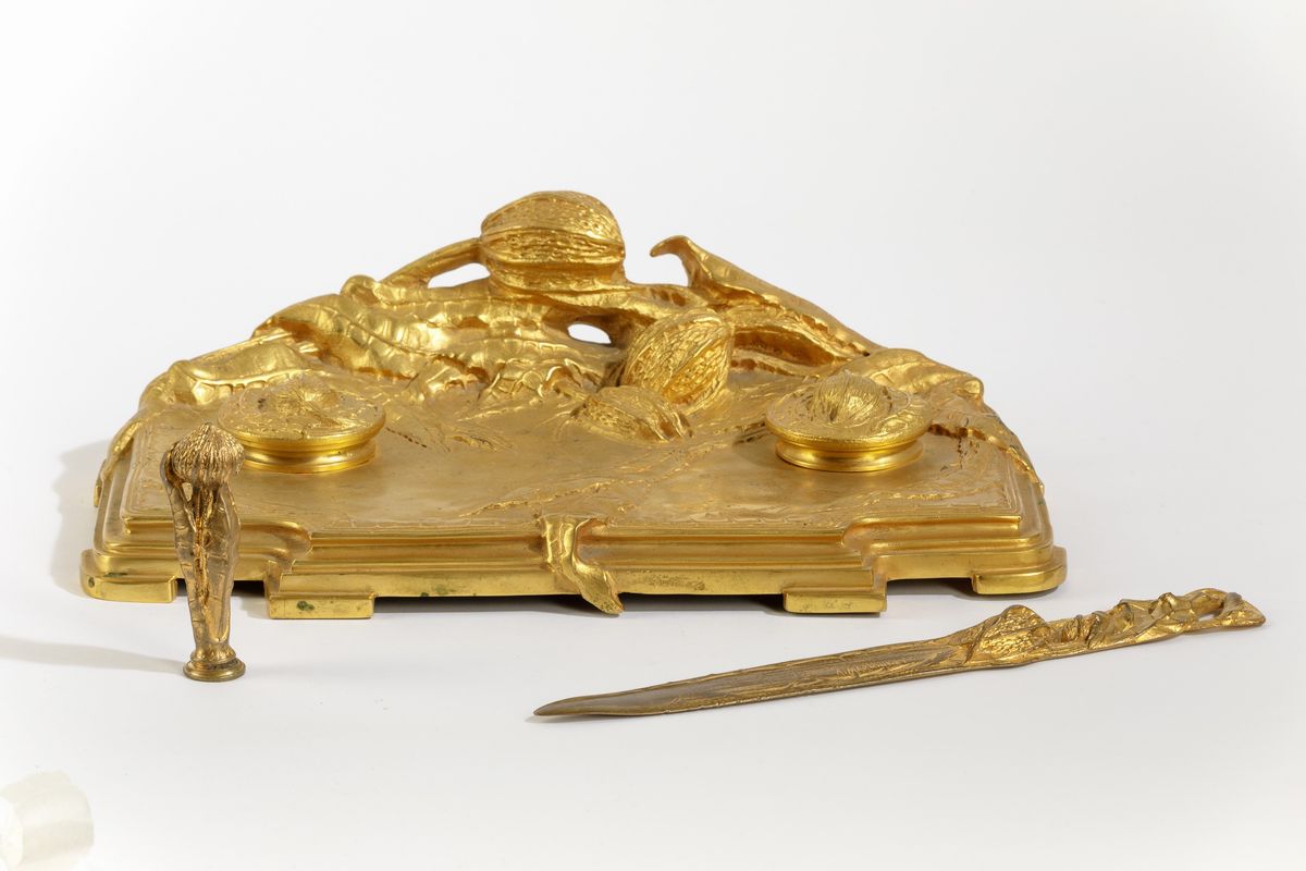 Grande calamaio da tavolo con sigillo e tagliacarte in metallo dorato con decoro ad alto rilievo floreale.