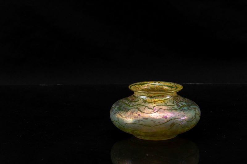 Vaso tondo schiacciato in vetro soffiato con decoro di lustri a onde.