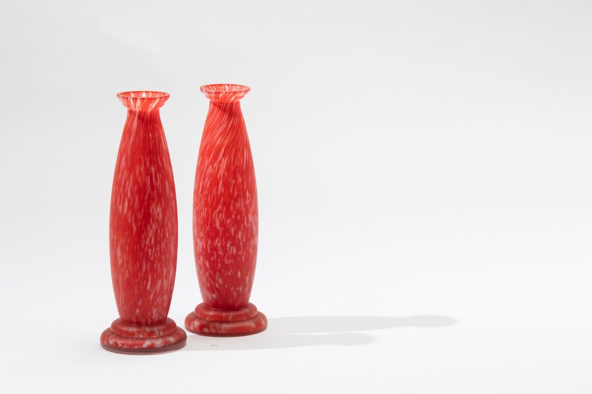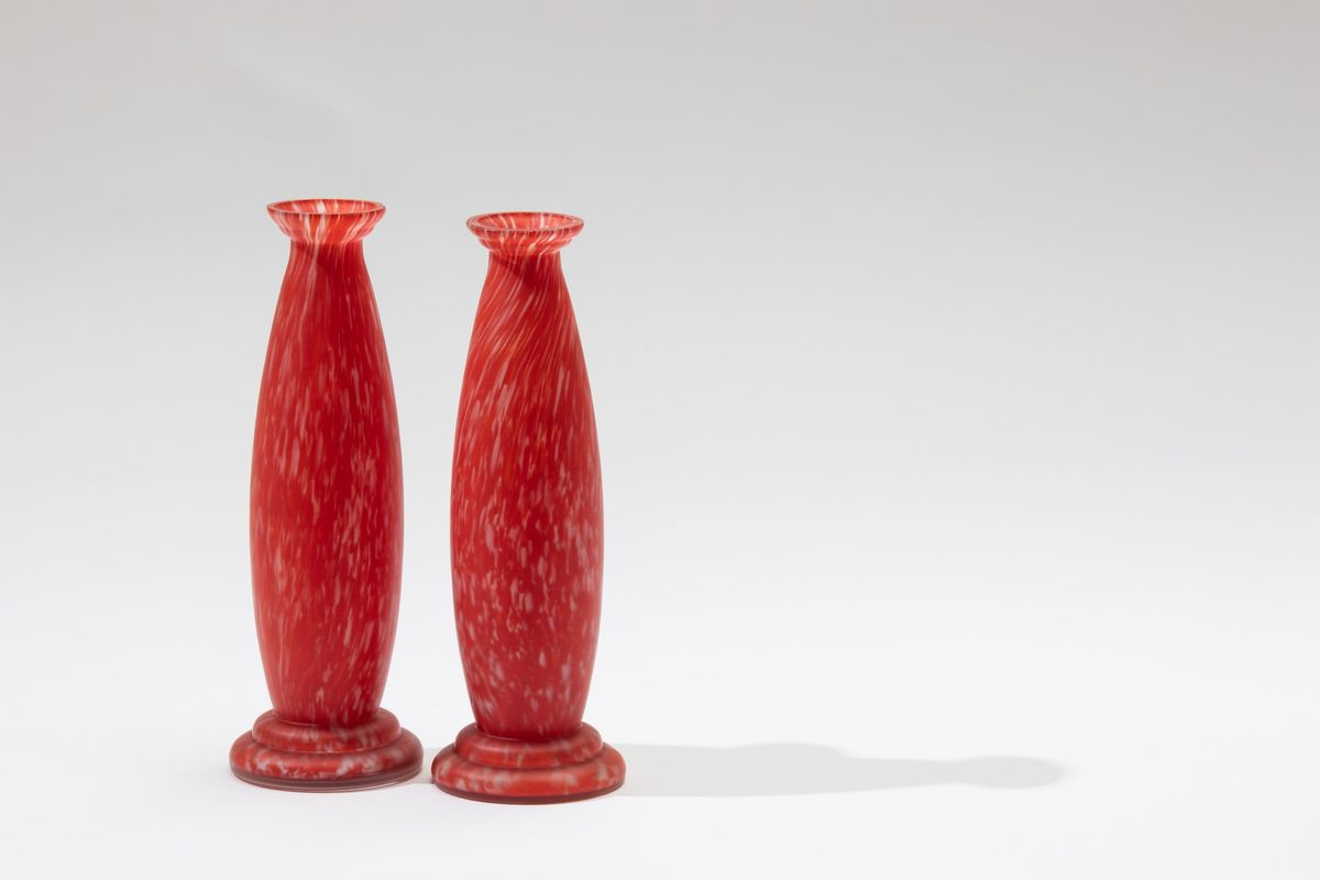 Coppia di piccoli vasi in vetro screziato sui toni del rosso.