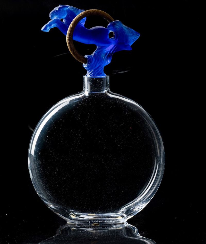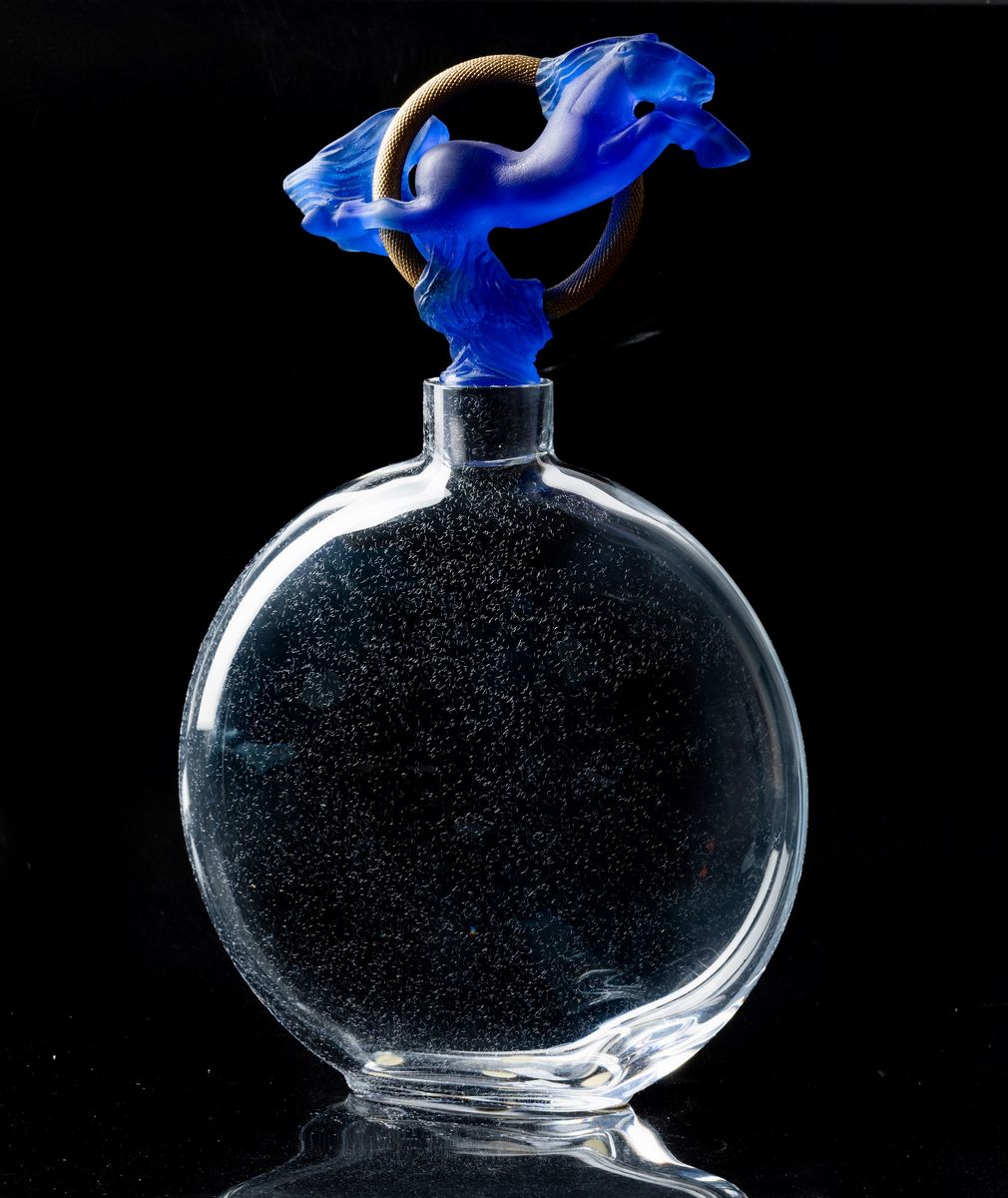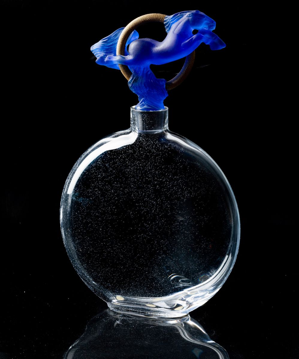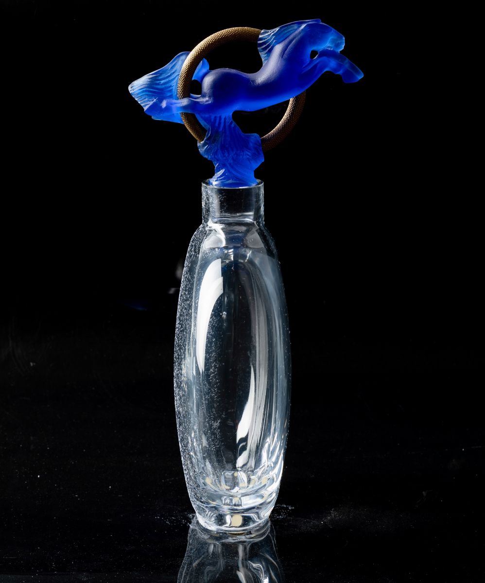 Bottiglia in cristallo soffiato trasparente con tappo in forma di cavallo rampante zaffiro e anello in metallo dorato. Scatola originale.