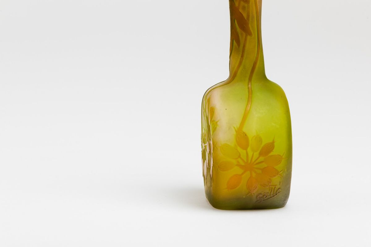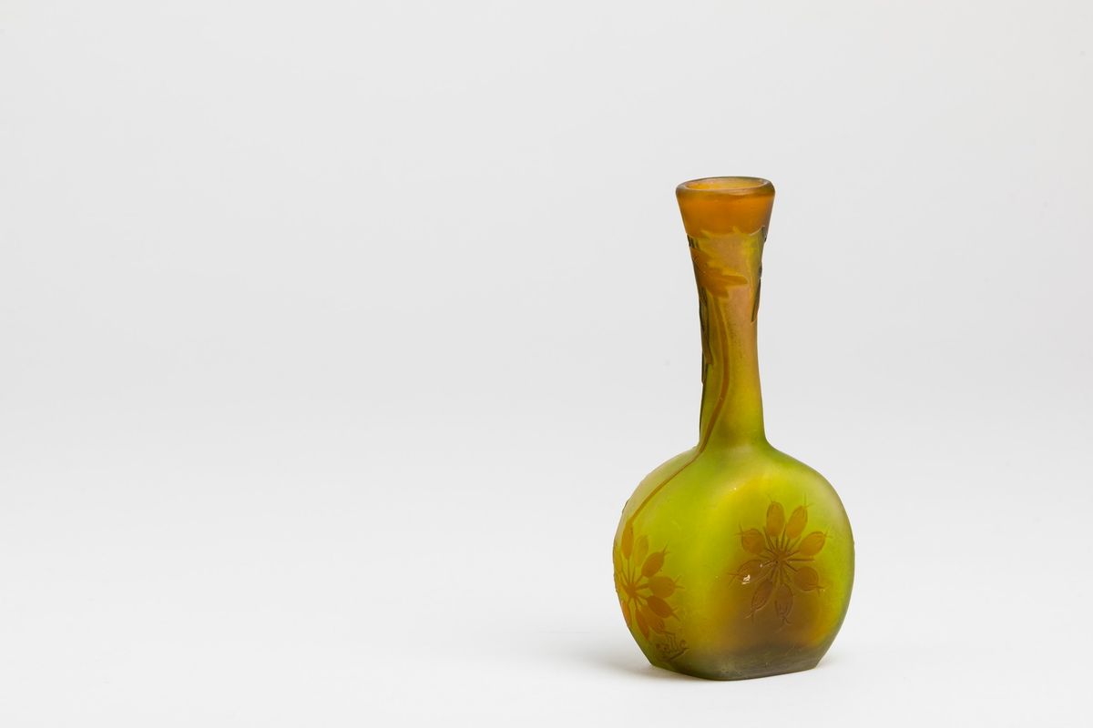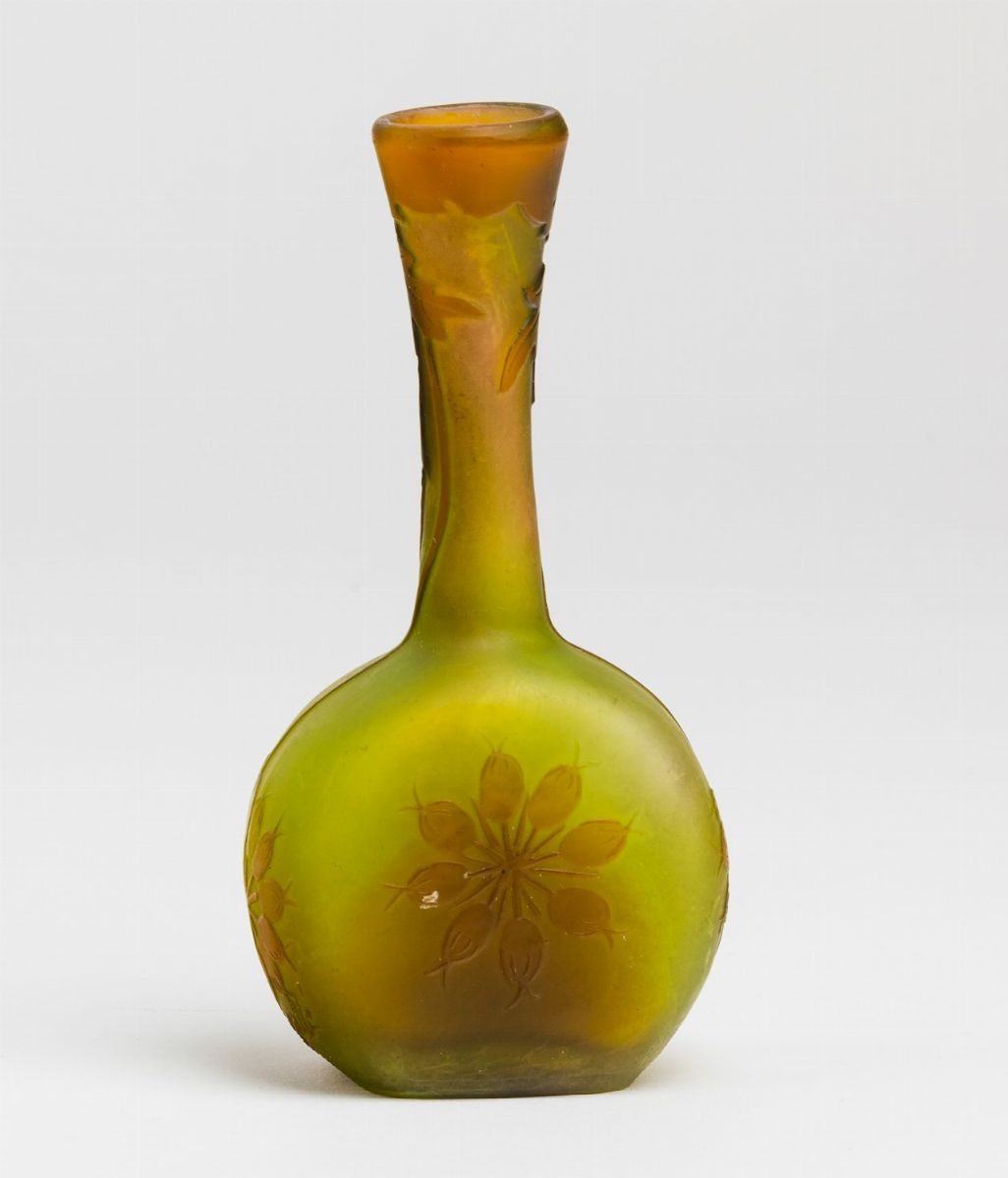 Vaso a mandolino in vetro a cammeo con decoro floreale. Firma a rilievo