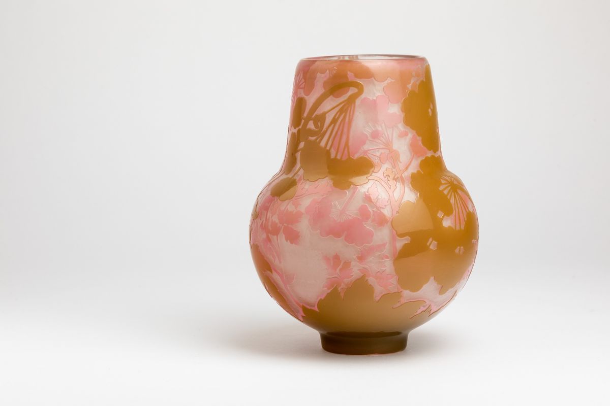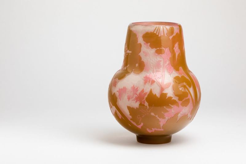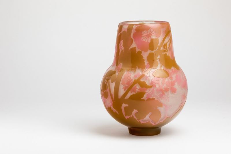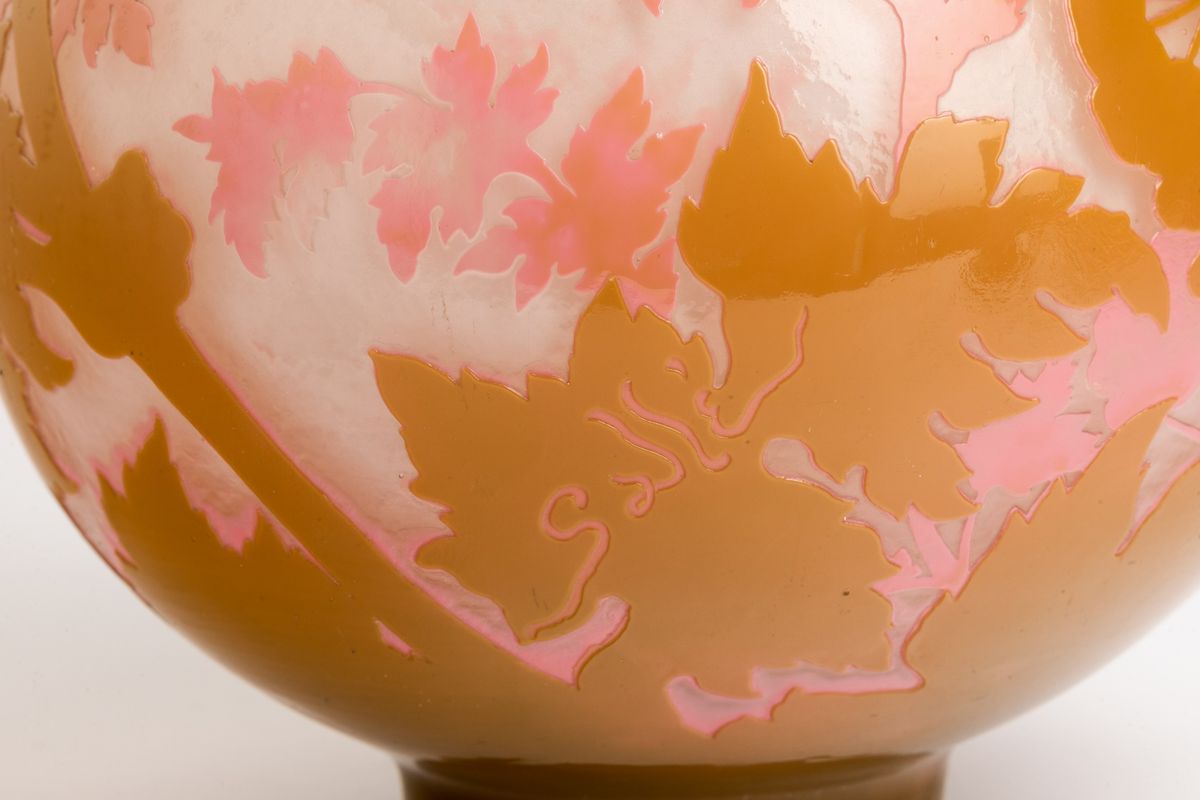 Vaso globulare con collo troncoconico e piede cilindrico in vetro a cammeo con decoro di verbene.