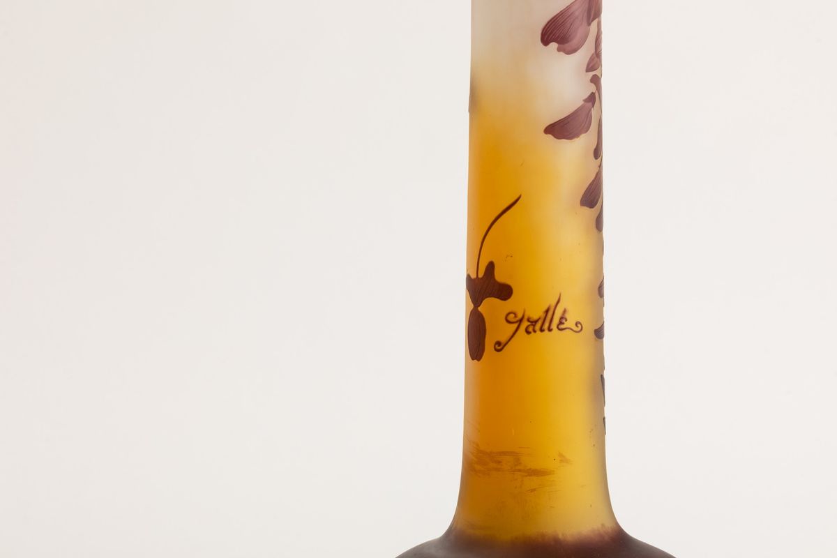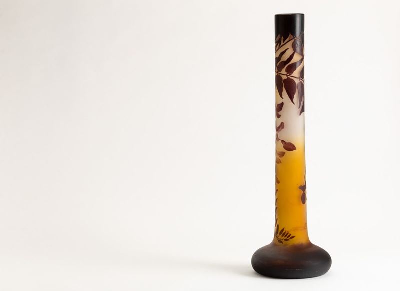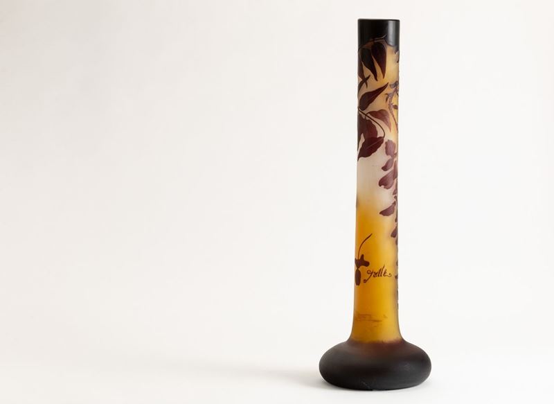 Vaso a clava in vetro a cammeo con decoro di glicine.