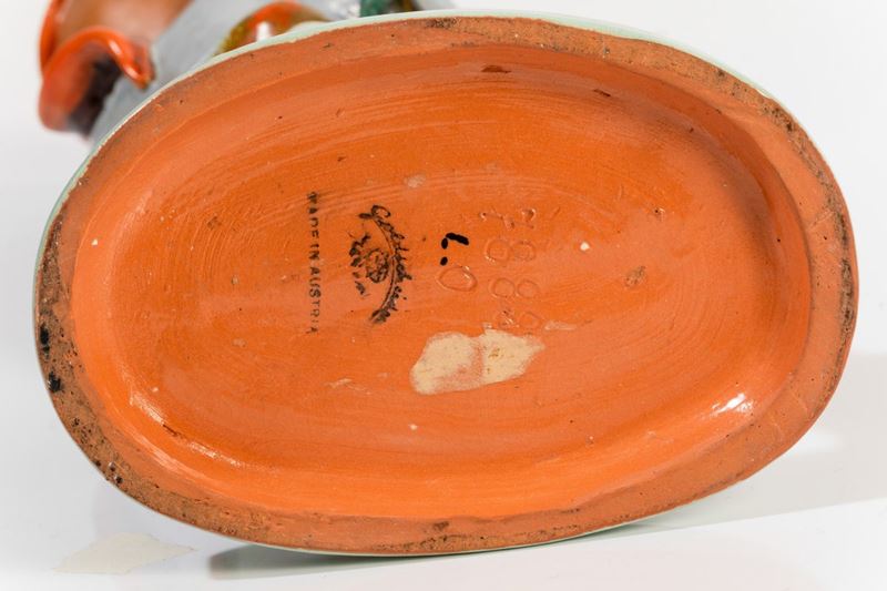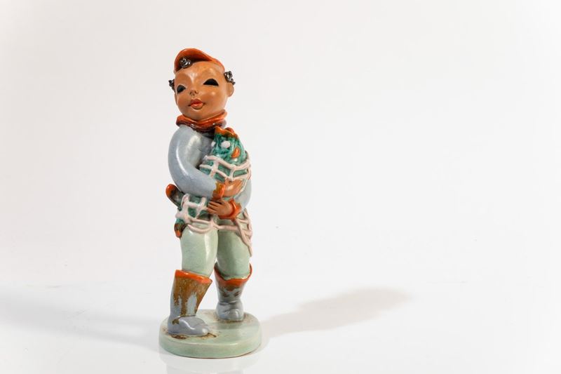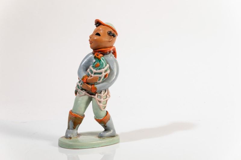 Figura di pescatore in ceramica con decoro a smalti.