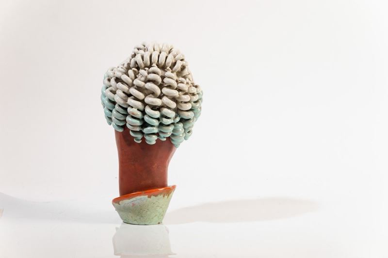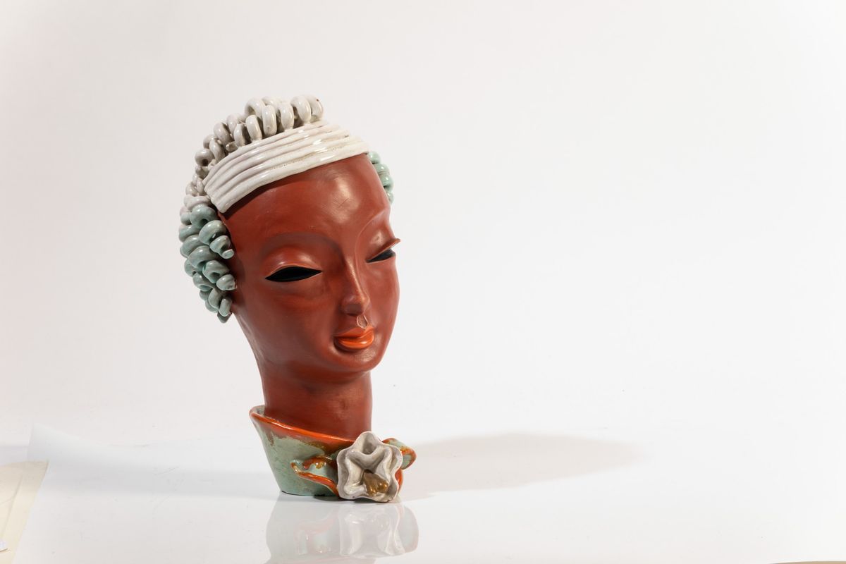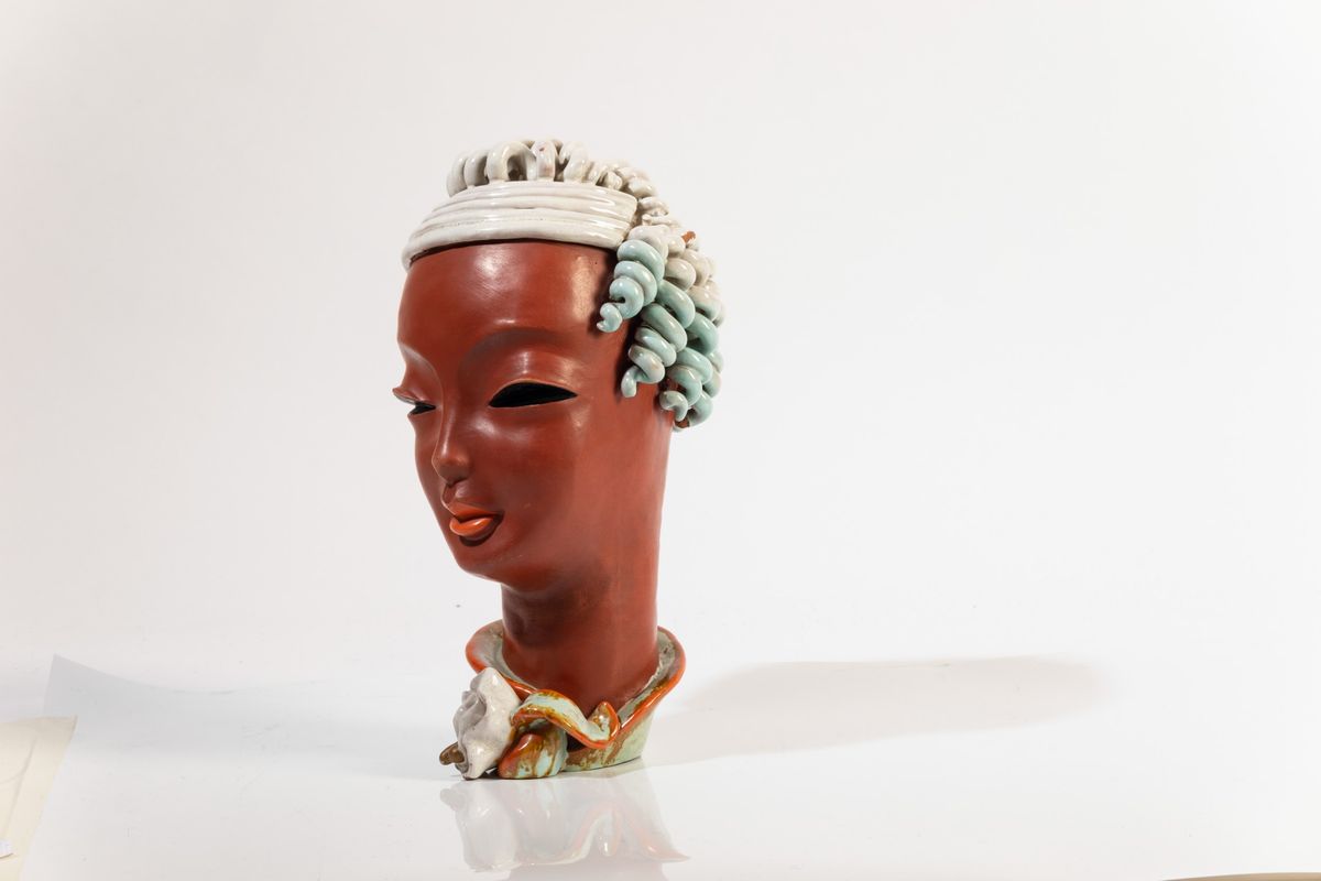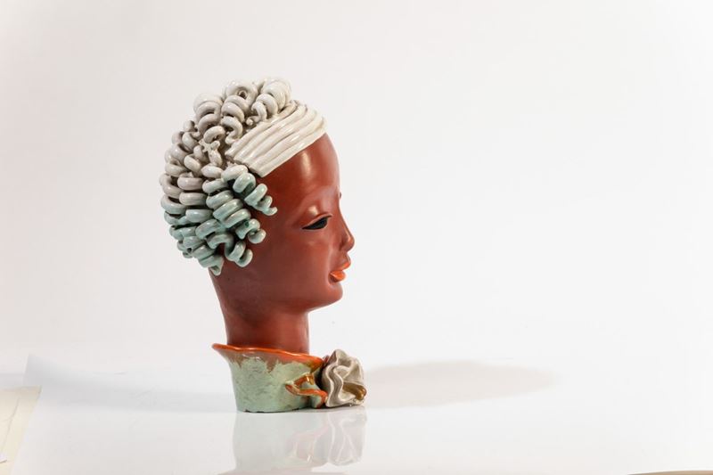 Testa di donna con cappellino in terracotta con decoro di smalti policromi.